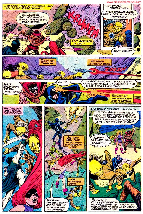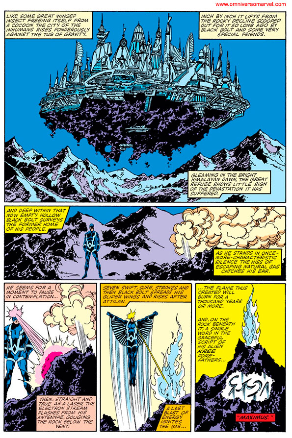 Para liberar a su gente de la barrera negativa impenetrable con la que Maximus (el hermano loco de Black Bolt) había rodeado la ciudad, Black Bolt tuvo que sacrificarla por el bien de los inhumanos, destruyendo la indestructible barrera y a la propia ciudad a la vez. 4F:v1:59. [Imagen1][Imagen2][Imagen3][Imagen4].