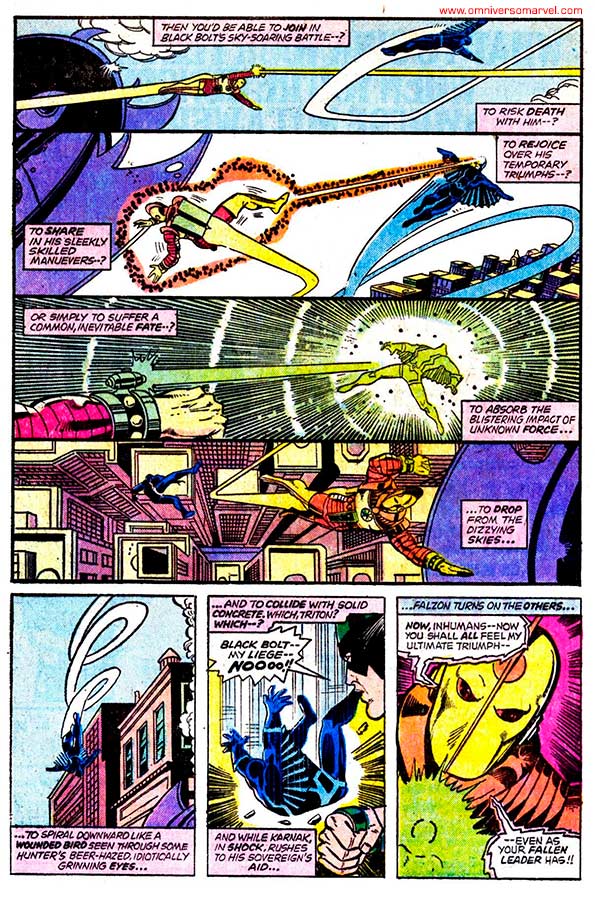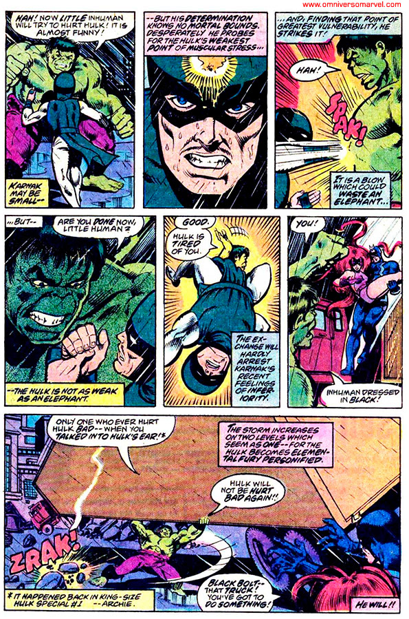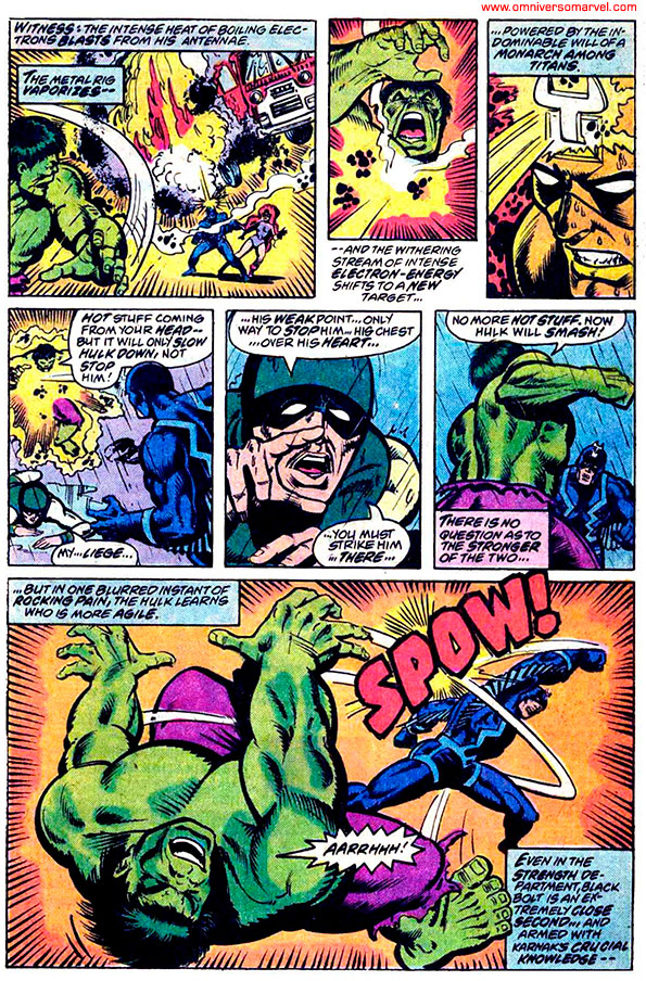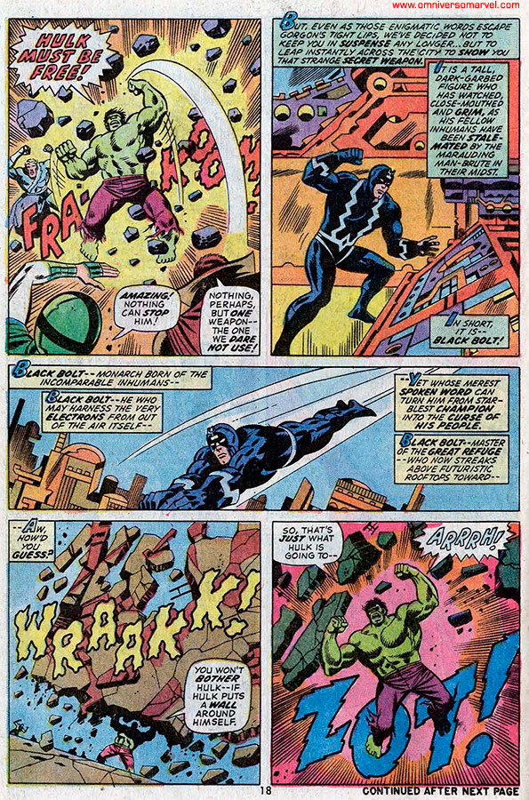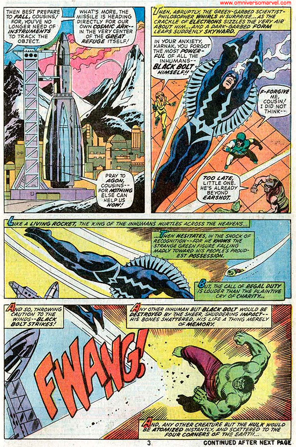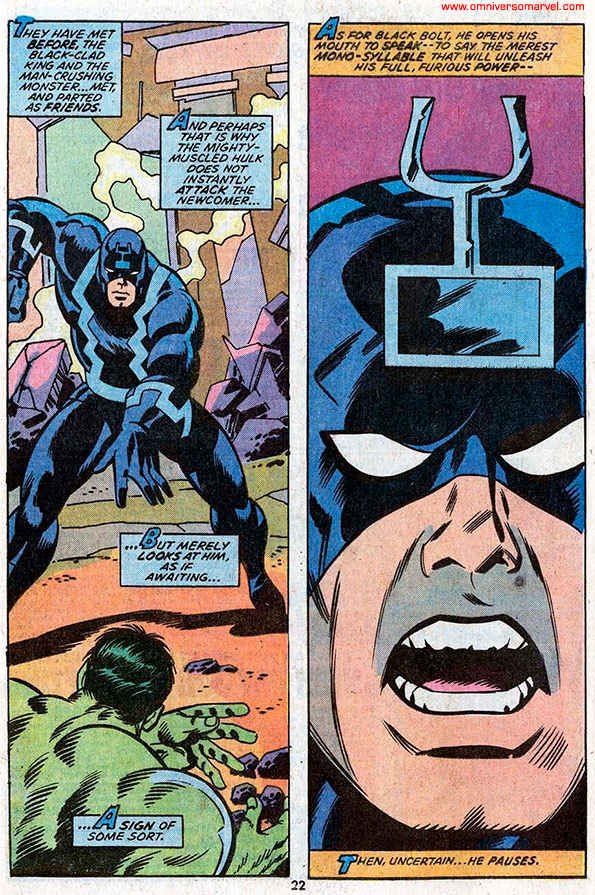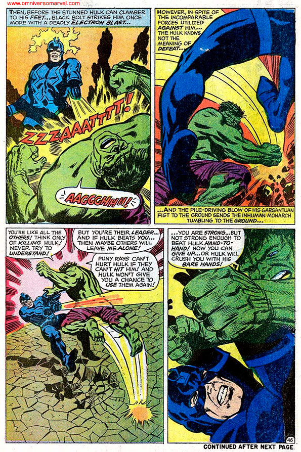 Comparado con Hulk (potencialmente el ser físico más poderoso del planeta), el narrador dice que, si bien Hulk supera a Black Bolt en fuerza, el rey inhumano tiene el segundo lugar por un margen muy cercano. InH:v1:12. [Imagen].