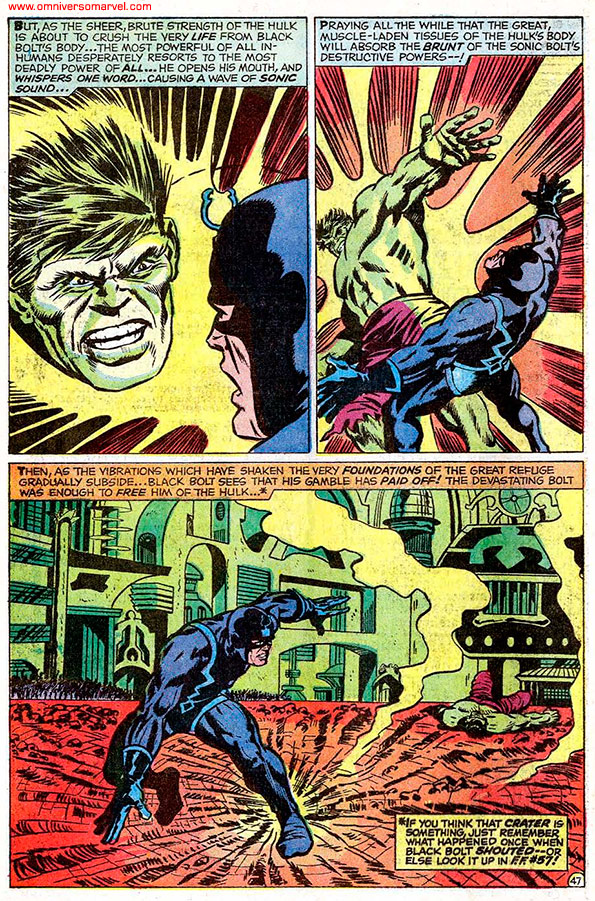 Black Bolt usaría su rayo de electrones para analizar el físico de Hulk, de tal modo que al emitir su grito cuasi-sónico este sólo dañara o afectara en mayor medida al gigante verde; aun así, su sonido destruyó gran parte del Gran Refugio tan fácilmente como se derrumba un castillo de naipes, incluso él mismo y sus inhumanos fueron afectados, pero Hulk se llevó la mayor potencia de su ataque dejándolo aturdido. IH:v1:175. [Imagen1][Imagen2][Imagen3][Imagen4][Imagen5][Imagen6].