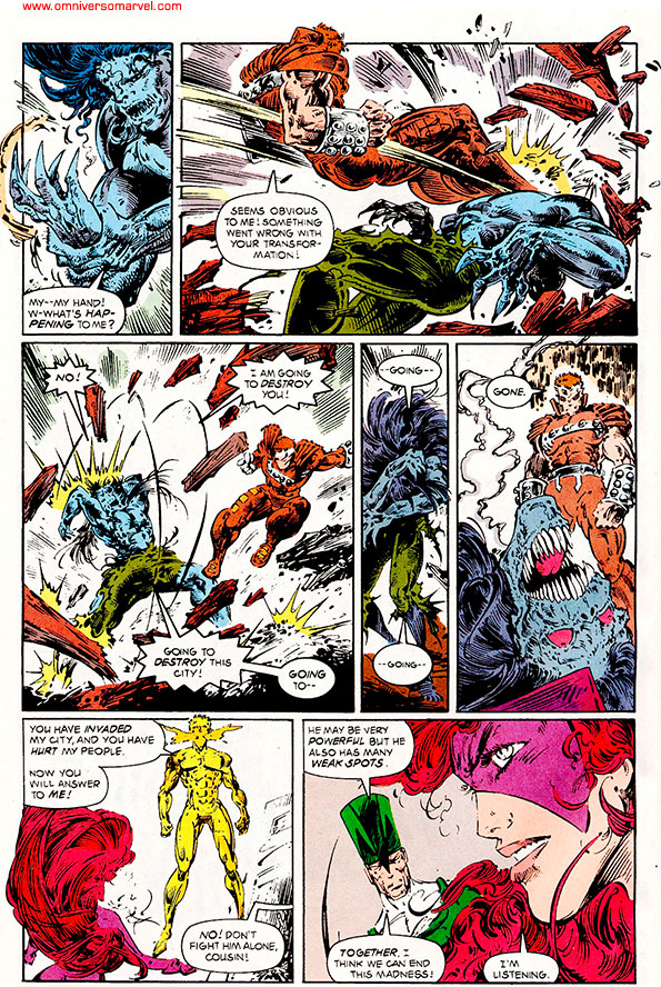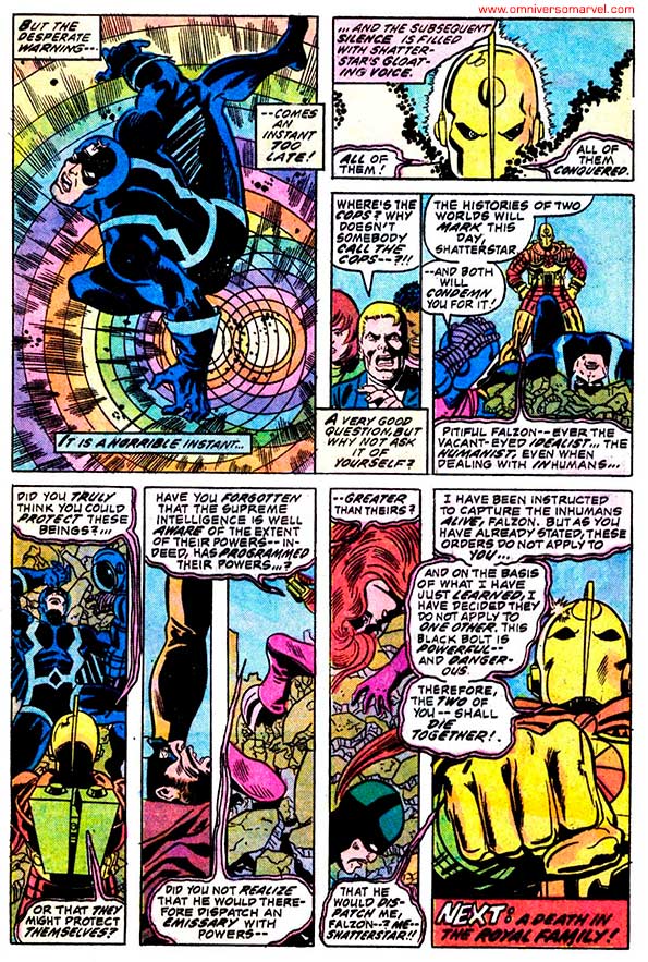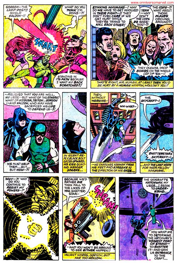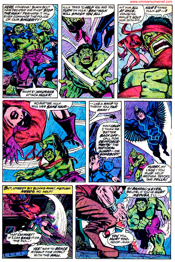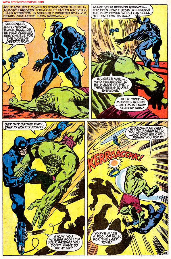 Hulk que llegó a la Luna en busca de Black Bolt, lo encontraría en compañía de Medusa, la reina queriendo evitar el combate y pretendiendo intimidar a Hulk, le advertiría que esa era una lucha que el gigante esmeralda no deseaba, que el Golpe Maestro de BB podría romper sus huesos y que el más ligero susurro lanzaría su cuerpo roto dentro del Sol. WWH:v1:1. [Imagen].