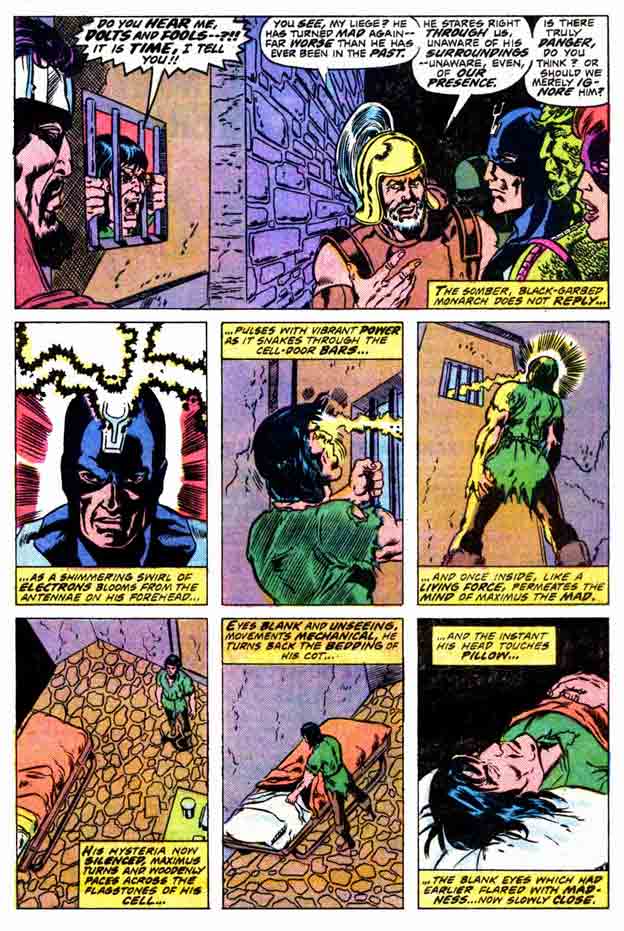 Maximus había implantado unas “arañas negras” una especie de virus en la mente de Quicksilver, Medusa, Ahura y Black Bolt provocando que estos actuaran de manera irracional, sin verdadero control sobre sus acciones. De todos ellos sólo Black Bolt había resistido el control de Maximus. SW:v1:6. [Imagen1][Imagen2].