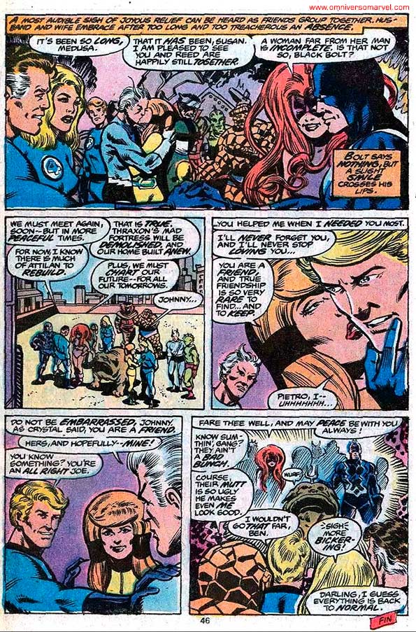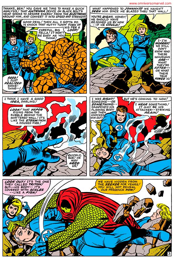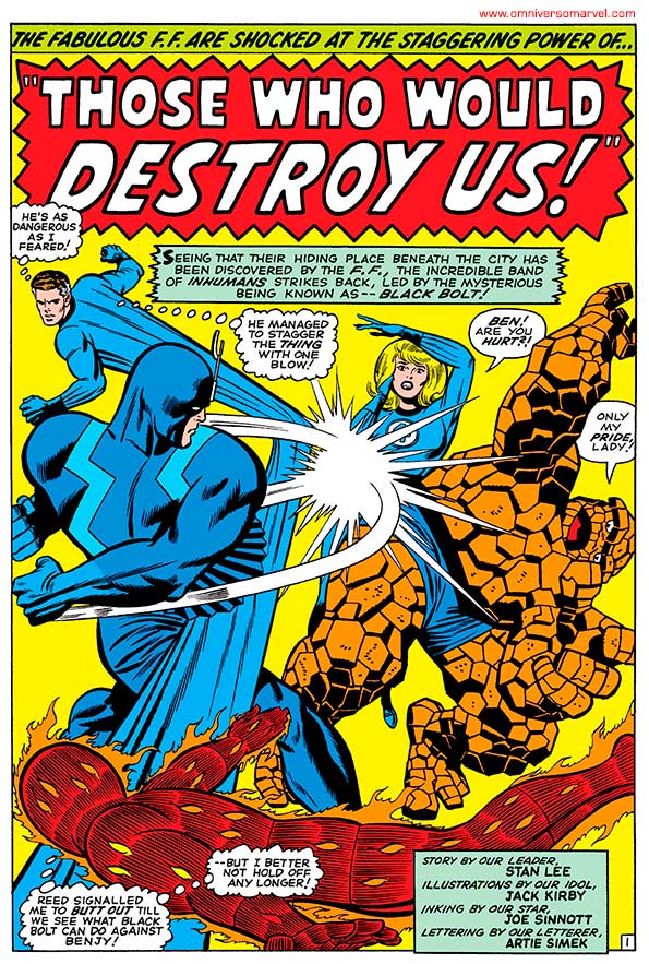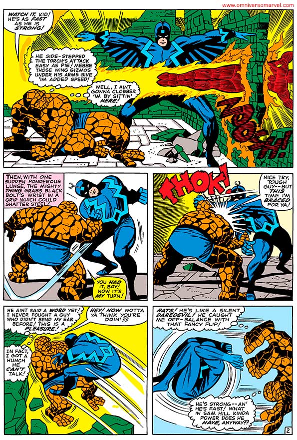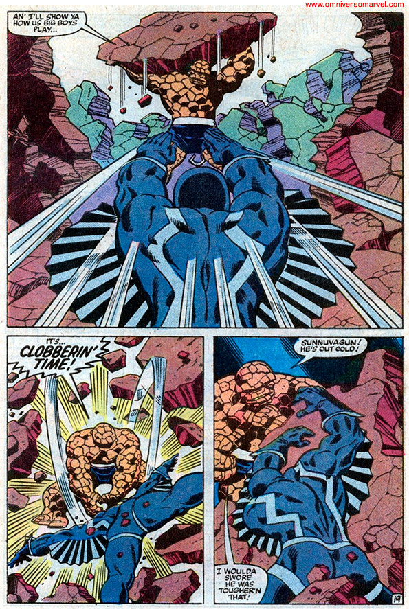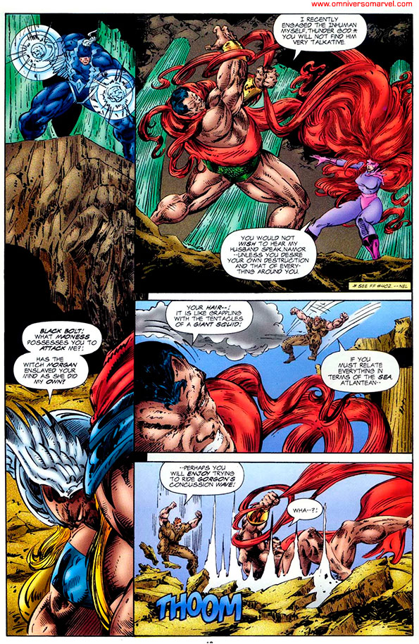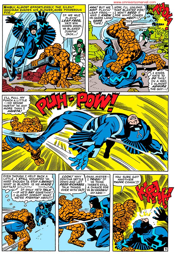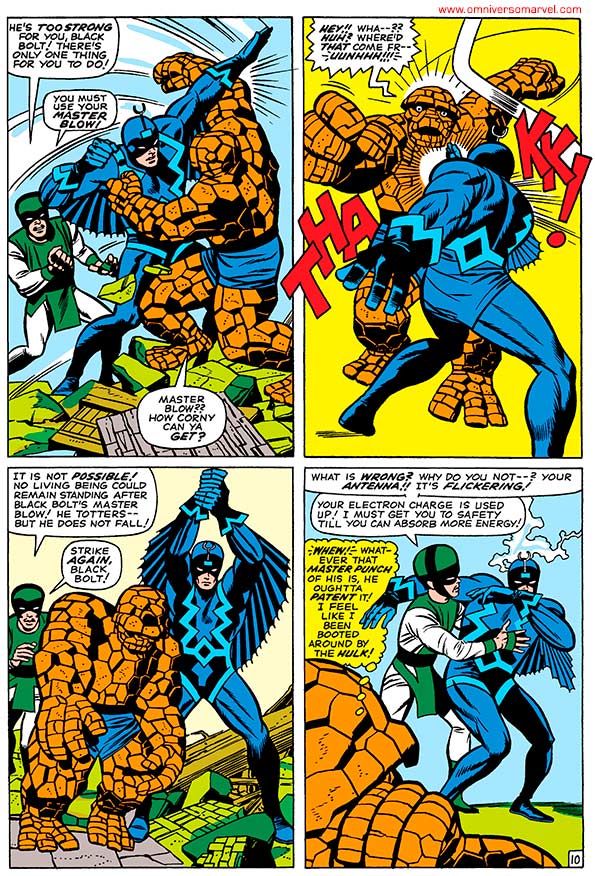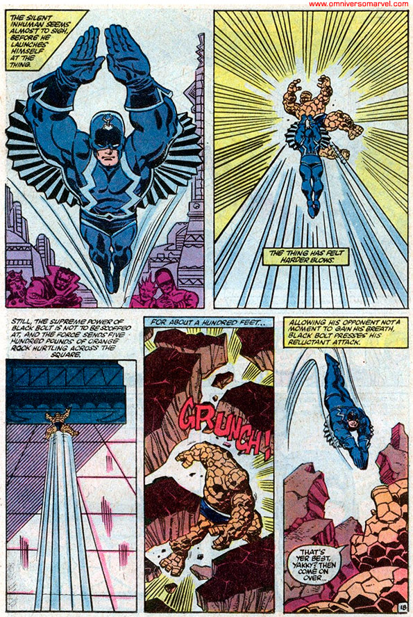 Black Bolt ha enfrentado a Namor, quien en la superficie es un igual de the Thing (La Mole, La Cosa). El intercambio de golpes estaba igualado, y antes de que Black Bolt usara su golpe maestro fue detenido por Sue. 4F:v1:402. [Imagen1][Imagen2][Imagen3][Imagen4][Imagen5][Imagen6].