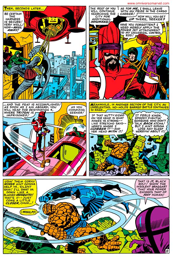 La Cosa (The Thing) por diferencias culturales y por pedido de Crystal se enfrentaría a la familia inhumana siendo Black Bolt quien atacaría primero, y aunque Ben estaba preparado, el poder supremo de Rayo lo mandaría a volar. Ben que no se da por vencido, contratacaría golpeando poderosamente al rey; aunque mareado Black Bolt asestaría un "débil golpe" a Ben, pero sería suficiente para mandar de nuevo a la simpática Cosa a volar. Th:v1:3. [Imagen1][Imagen2][Imagen3][Imagen4].