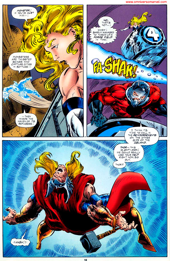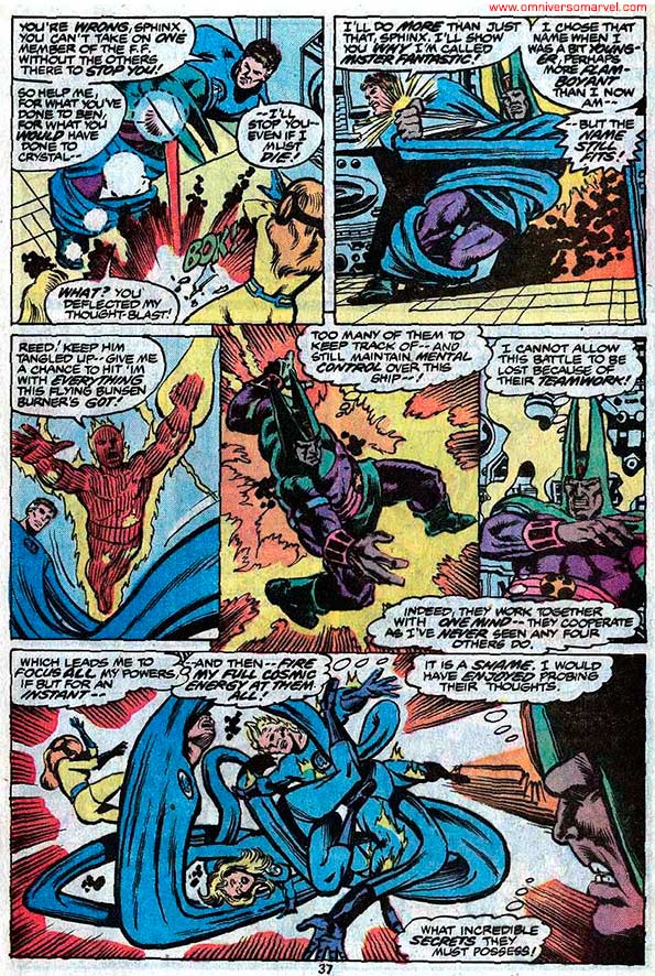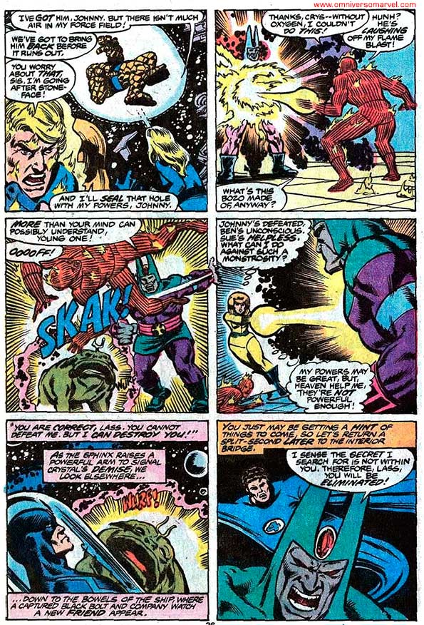 Tan sólo el sonido de una simple silaba ha tenido suficiente poder para desprender los cimientos de toda la ciudad de Attilan. 4F:v1:240. [Imagen1][Imagen2].