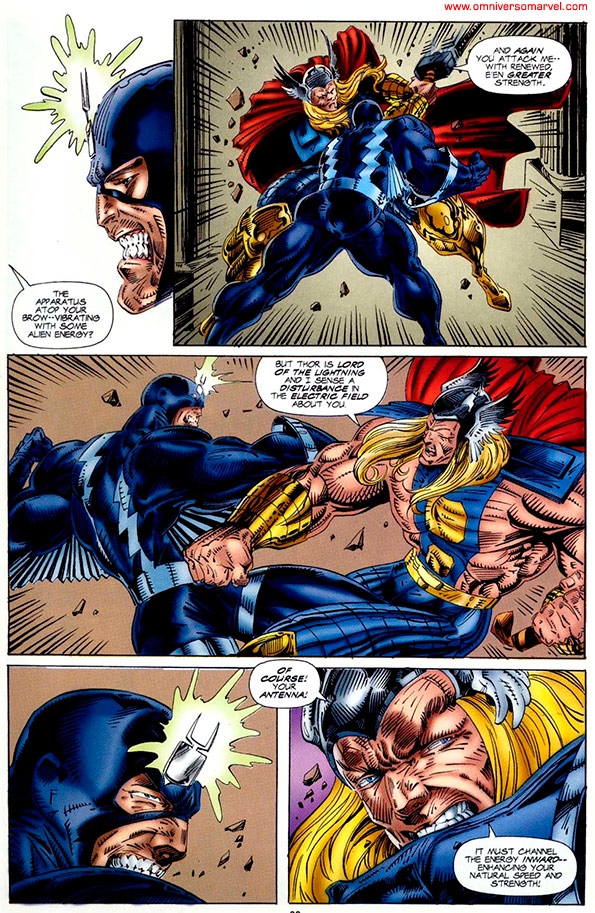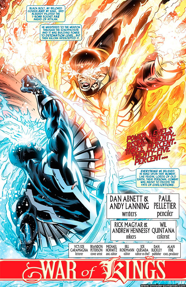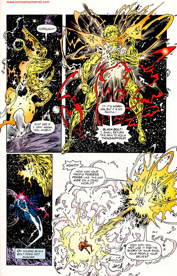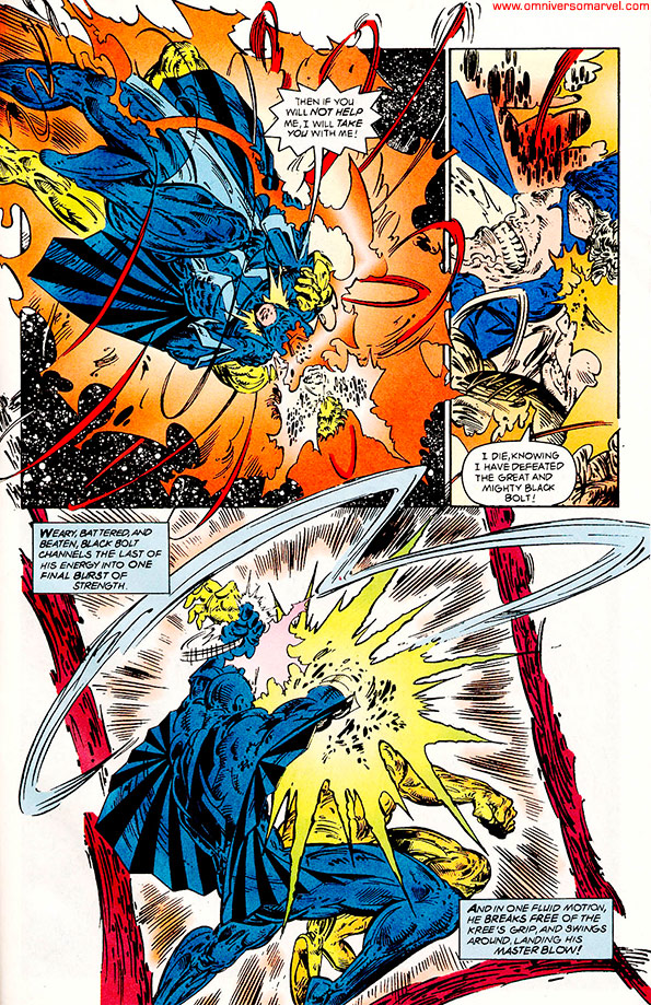 Black Bolt libraría uno de sus más feroces combates contra Vulcan (Gabriel Summers), en el que ambos emplearían todas sus habilidades como manipuladores de electrones y fuentes de energía, fuerza y resistencia, sólo al final emplearía Black Bolt su voz para derrotarlo. Vulcan es mutante nivel omega, él puede absorber y manipular energía, puede crear poderosos campos de fuerza telequinéticos, absorber los poderes de sus oponentes, lanzar poderosos rayos, suprimir temporalmente los poderes de otros, es capaz de reformarse a sí mismo, etc (tal vez todo esto explique por qué no quedo completamente desintegrado por la voz de Black Bolt). WOK:v1:6. [Imagen1][Imagen2][Imagen3][Imagen4][Imagen5][Imagen6][Imagen7][Imagen8][Imagen9][Imagen10][Imagen11][Imagen12][Imagen13][Imagen14][Imagen15].