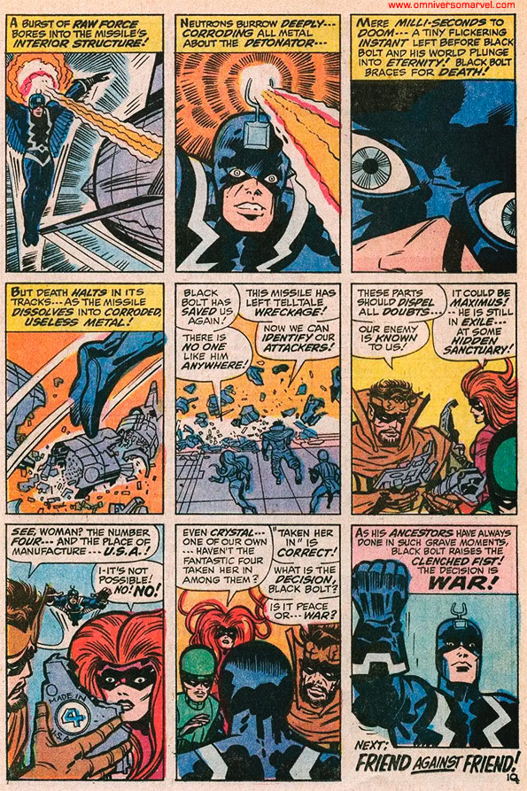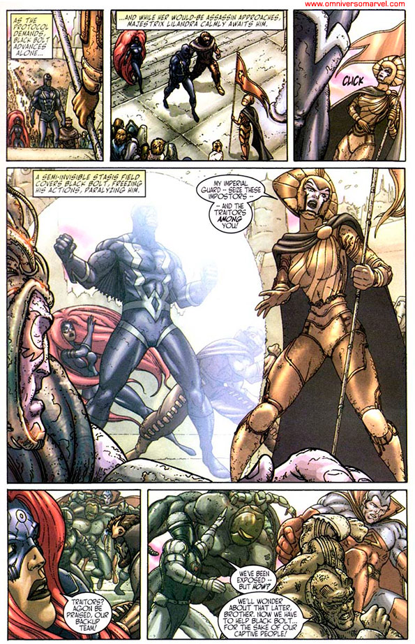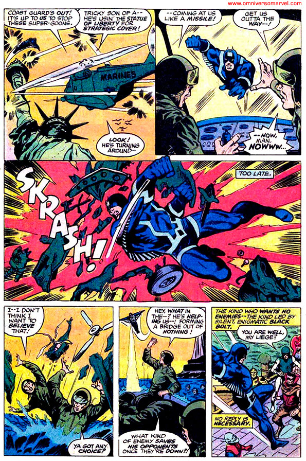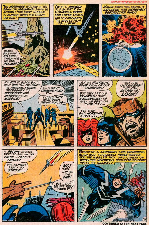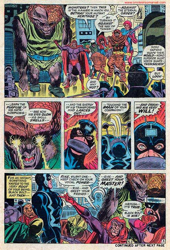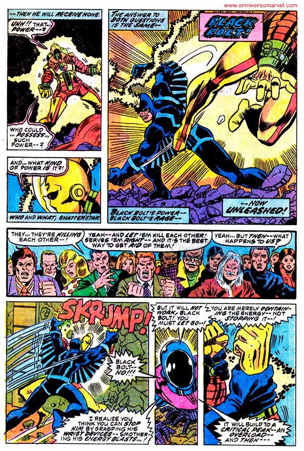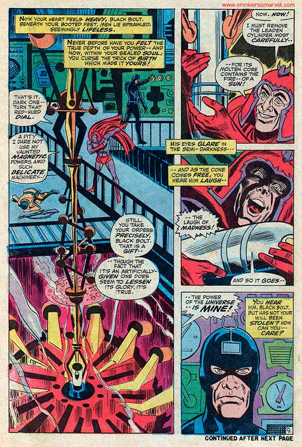 Magneto usó una máquina para desarrollar aún más los poderes mentales de uno de sus mutantes con el fin dominar la voluntad de Black Bolt, y usarlo para asaltar una instalación del gobierno que había desarrollado una nueva fuente de poder cósmico. Black Bolt sólo fingiría haber sucumbido al poder mental del mutante resistiéndose durante horas a su dominio, y sólo esperaría el momento oportuno para contratacar. AA:v2:10. [Imagen1][Imagen2][Imagen3][Imagen4][Imagen5][Imagen6][Imagen7].