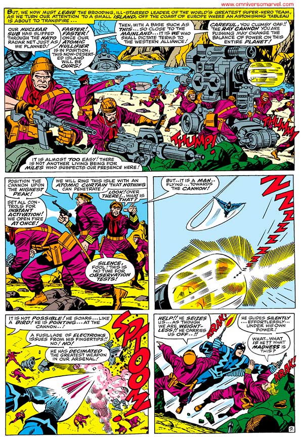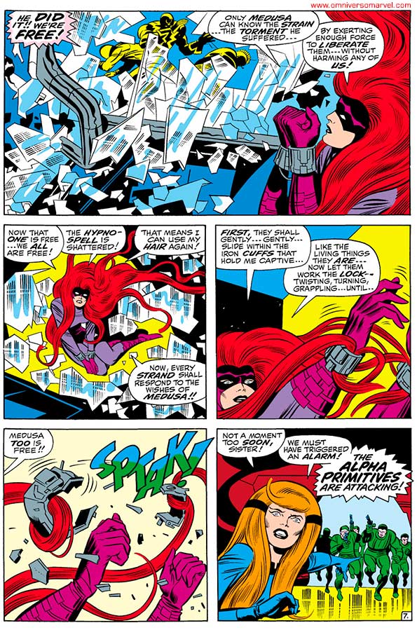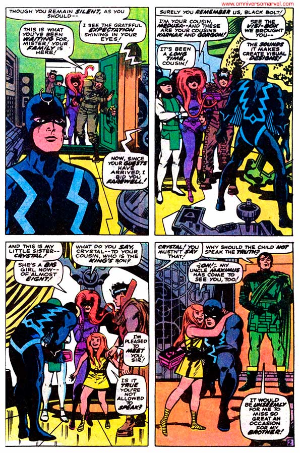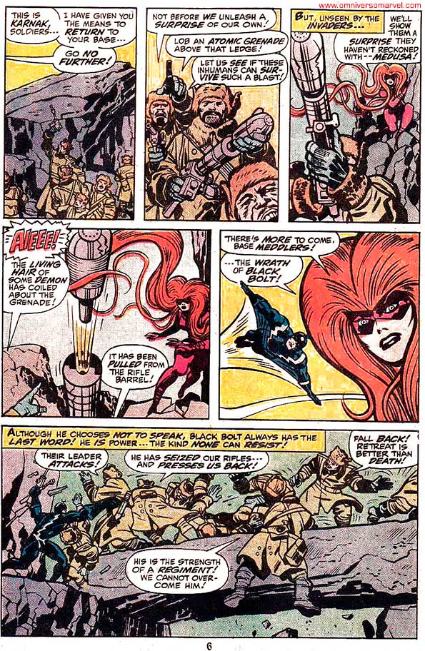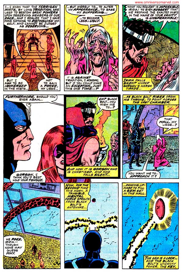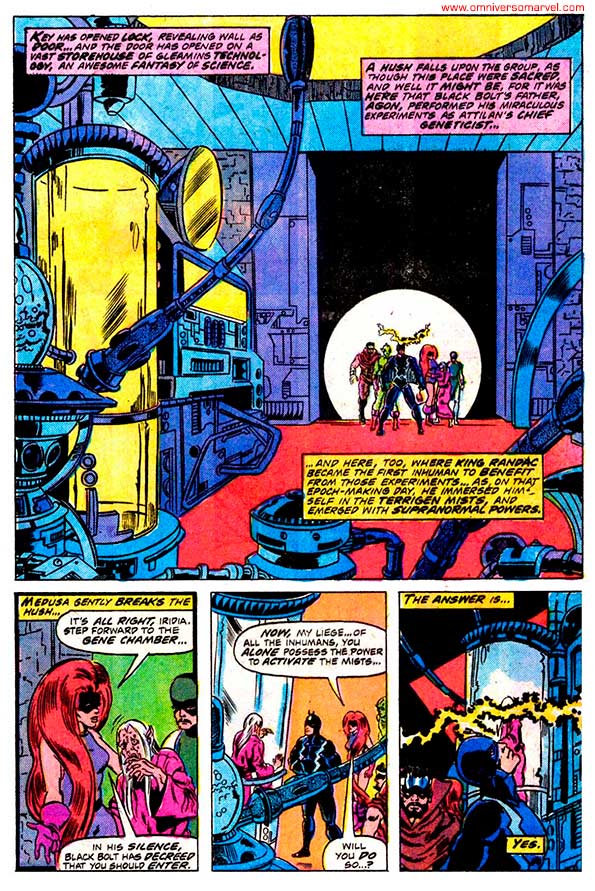 Magneto usó una máquina para desarrollar aún más los poderes mentales de uno de sus mutantes con el fin dominar la voluntad de Black Bolt, y usarlo para asaltar una instalación del gobierno que había desarrollado una nueva fuente de poder cósmico. Black Bolt sólo fingiría haber sucumbido al poder mental del mutante resistiéndose durante horas a su dominio, y sólo esperaría el momento oportuno para contratacar. AA:v2:10. [Imagen1][Imagen2][Imagen3][Imagen4][Imagen5][Imagen6][Imagen7].
