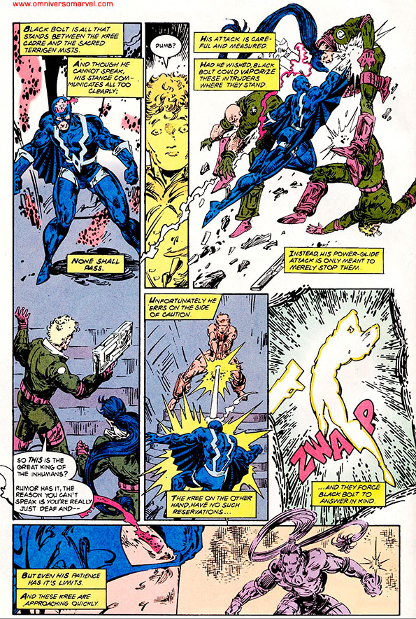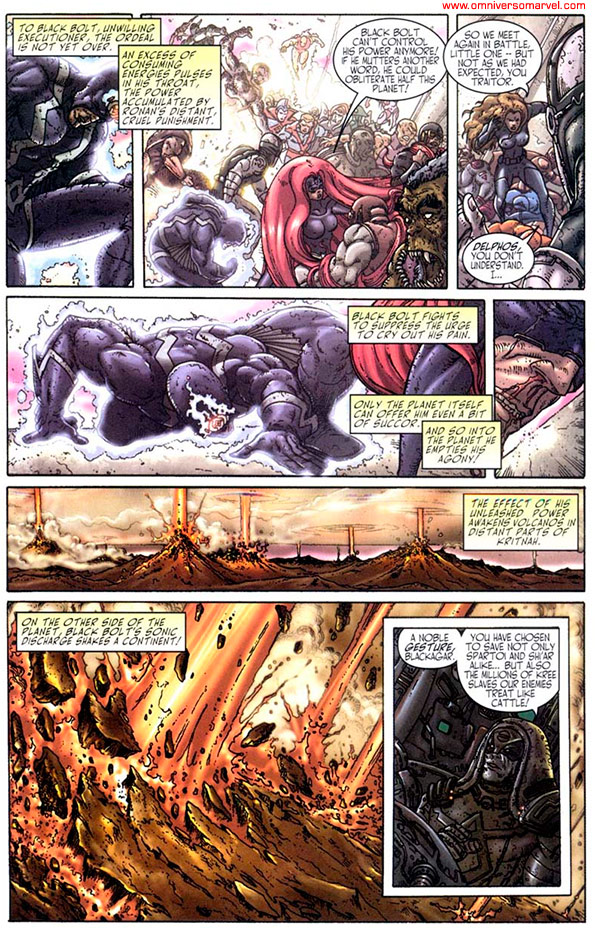 De la fuerza de la voz de Black Bolt se dice que puede destruir montañas y planetas incluso. Durante su cautiverio por los Kree, fue usado por Ronan El Acusador como uno de sus guerreros, un arma para destruir a la emperatriz Lilandra de los Shi'ar. Provisto de un mecanismo que le causaba un dolor indescriptible, el adolorido Black Bolt trataría de no gritar. Un mínimo susurro fue como un huracán para la emperatriz. Llevado hasta el límite de su resistencia y evitando matar a todos, Rayo dirigió su agonía al suelo del planeta, activando distantes volcanes y partiendo un continente al otro lado del planeta!! (Medusa también menciona que de haber murmurado una palabra hubiera borrado la mitad del planeta). InH:v3:4. [Imagen1][Imagen2][Imagen3][Imagen4][Imagen5][Imagen6][Imagen7][Imagen8].