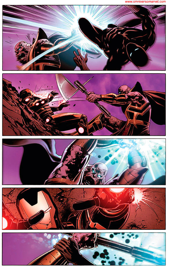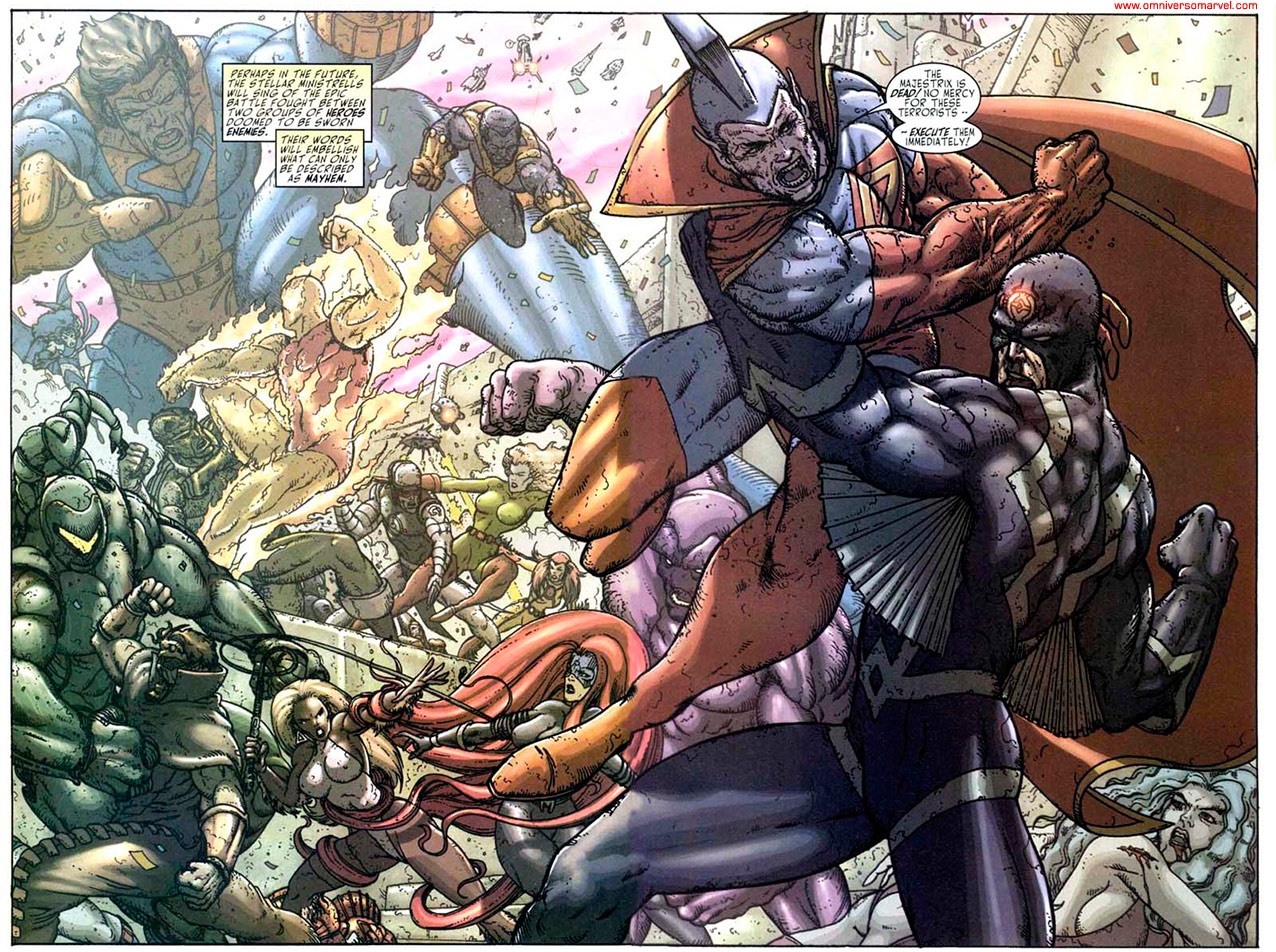 * Hay que notar un dato importante que se supo después de este combate con Thanos y sus camaradas Illuminati. Maximus reveló que a consecuencia de la Bomba Terrigen, los poderes de Rayo estaban grandemente disminuidos, habría que considerar que hubiera pasado en ambos combates con un Rayo Negro a toda su capacidad. NA:v3:12. [Imagen].