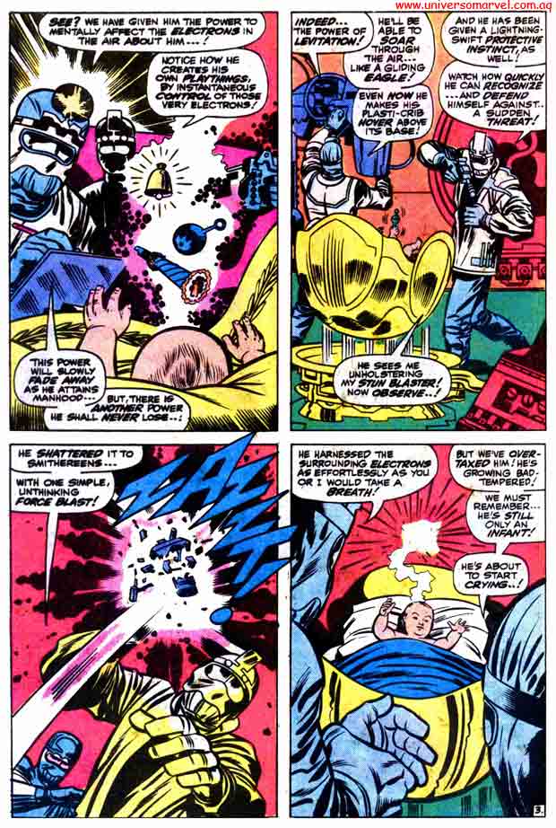 Apenas recién nacido Black Bolt materializaría sus propios juguetes ensamblándolos mediante su control de electrones del medio ambiente. T:v1:148. [Imagen].