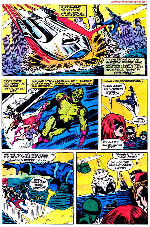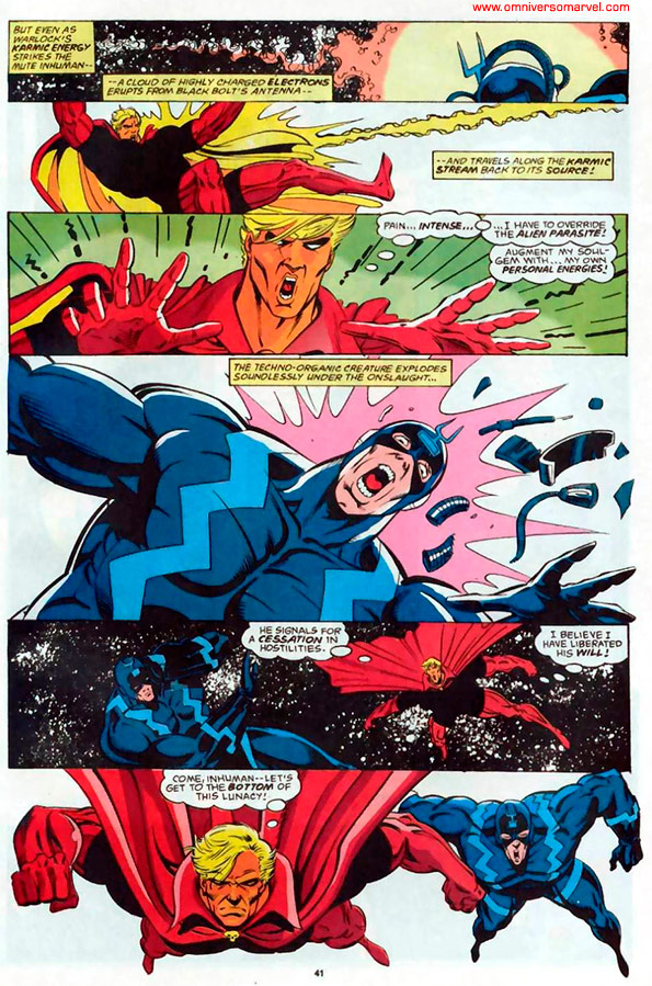 Warkon, buscaba destruir la estación espacial de los Kree, provocando una sobre carga. Sin embargo, nadie tendría tiempo de escapar a la inminente explosión, la rápida actuación de Black Bolt y el control que el Rey tiene sobre los átomos y la materia le permitirían frenar el ritmo de la implosión dándoles el tiempo necesario para escapar. InH:v1:10. [Imagen1][Imagen2][Imagen3].