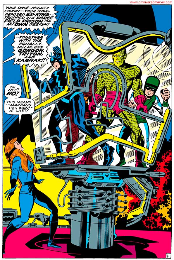 Recordándole como su llanto cuando nació casi demolió la ciudad, Maximus le dispararía con su Nerve-Beam, un arma capaz de atacar su sistema nervioso, produciéndolo indescriptible dolor, pero el Rey Inhumano no dejaría escapar ningún sonido. T:v1:149. [Imagen1][Imagen2][Imagen3].