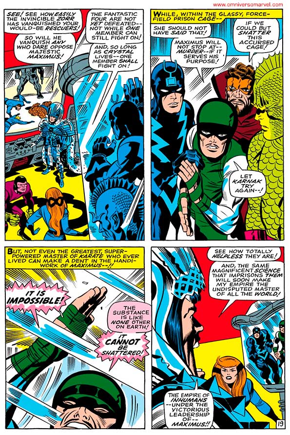 Maximus diseñó una prisión especial, una capaz de resistir el poder de la familia real inhumana; ni Karnak con su poder de encontrar el punto débil de cualquier cosa (que incluso llegó a afirmar que la barrera era imposible de romper) o Gorgon con sus poderosas patadas podían romper, el propio Black Bolt no podía usar su poder sin causarles daño (matarlos posiblemente) a sus amigos y familiares. Para lograr escapar sin dañar a nadie el tono logrado debía ser perfecto, un control total sobre su voz. BB prácticamente tenía que contener el poder aunque aquello le causara enorme tensión y tormento. 4F:v1:82-83. [Imagen1][Imagen2][Imagen3][Imagen4][Imagen5][Imagen6][Imagen7][Imagen8].