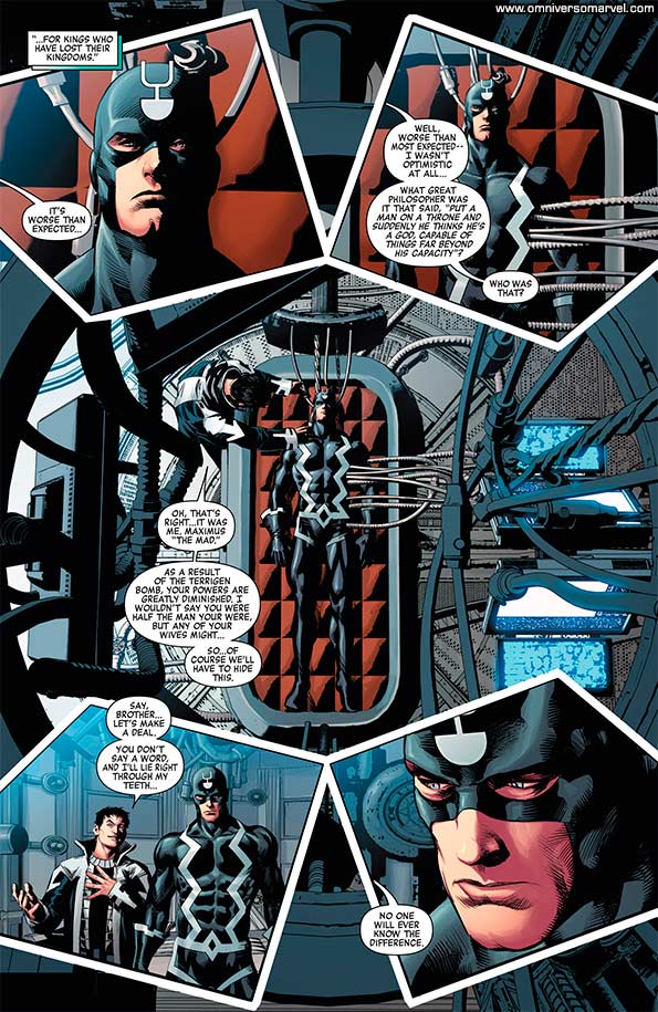 * Black Bolt recuperaría sus poderes completamente luego que Maximus lo curara gracias a las aguas exogeneticamente cargadas. NA:v3:18. [Imagen1][Imagen2].