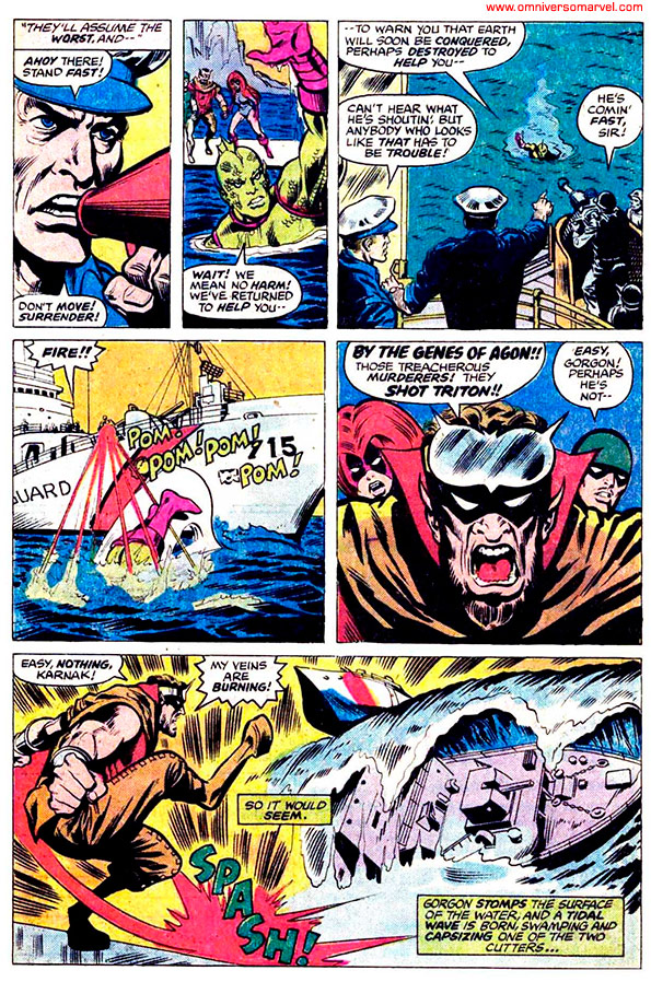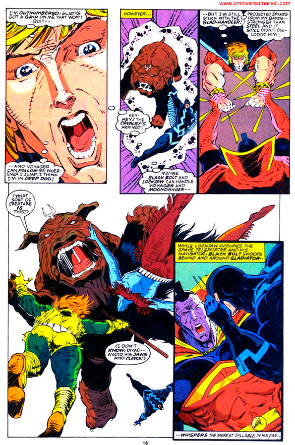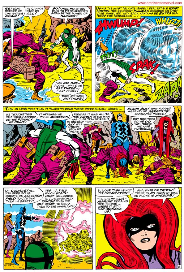 Gorgon no se daría ni cuanta de donde y como apareció Black Bolt delante de él, tan veloz como para protegerlo de una doble ráfaga de rayos!. InH:v1:7. [Imagen].