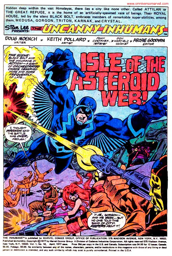 Black Bolt Rey de Attilan, Emperador del Imperio Kree, inhumano. Junto con los miembros de la familia real (Medusa, Gorgon, Karnak, Triton, Crystal, Lockjaw y Maximus el loco) forman los poderosos y extraños inhumanos.