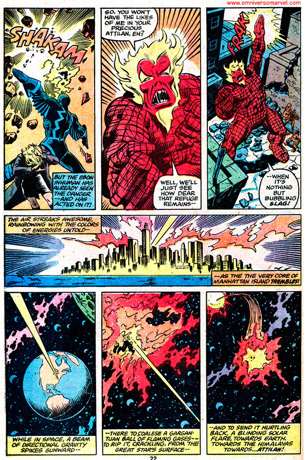 Graviton que mandaría un rayo de gravedad focalizada, fusionaría una gigantesca bola de llameantes gases que arrancaría de la gran superficie solar, trayéndola con dirección a la Tierra, directo a Attilan. La amenaza planetaria fue rápidamente interceptada por Rayo quien manipularía los electrones en un rayo de alta energía capaz de destruir la gigantesca erupción solar. MTIOann:v1:4. [Imagen1][Imagen2][Imagen3][Imagen4].