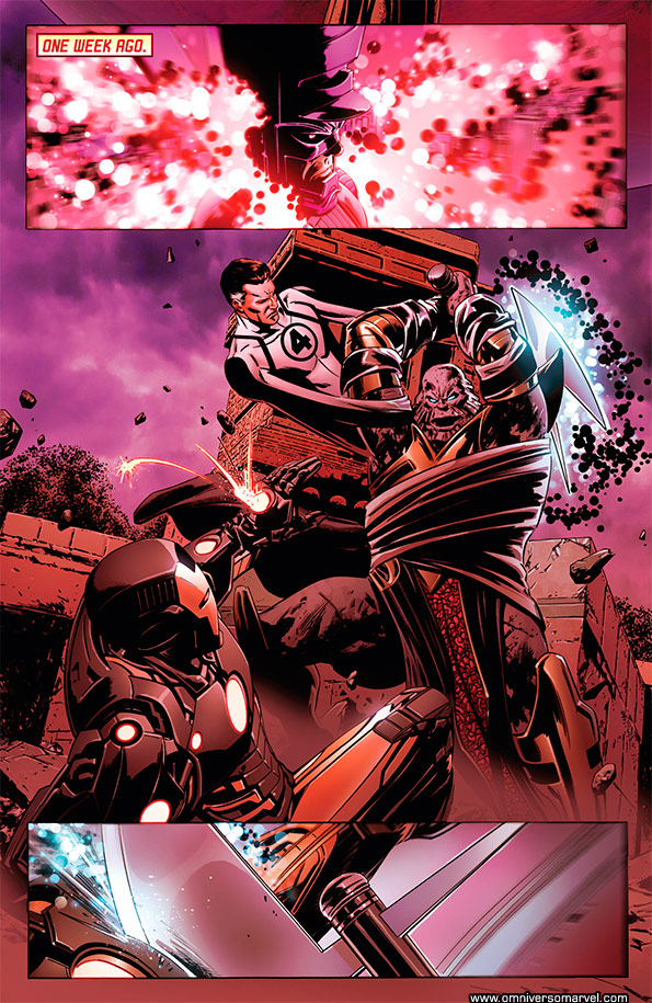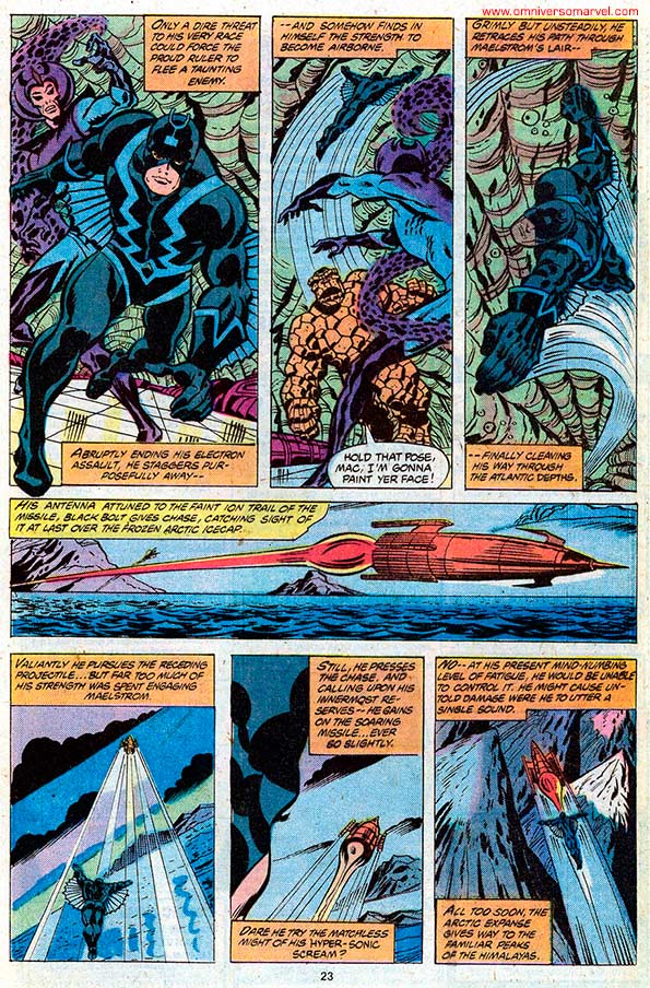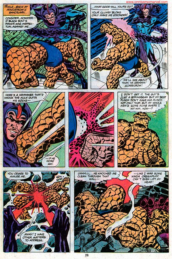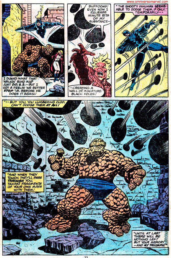 Black Bolt esquivaría el "muro" de mini agujeros negros que Graviton les lanzara a él y a Ben Grimm. MTIOann:v1:4. [Imagen].