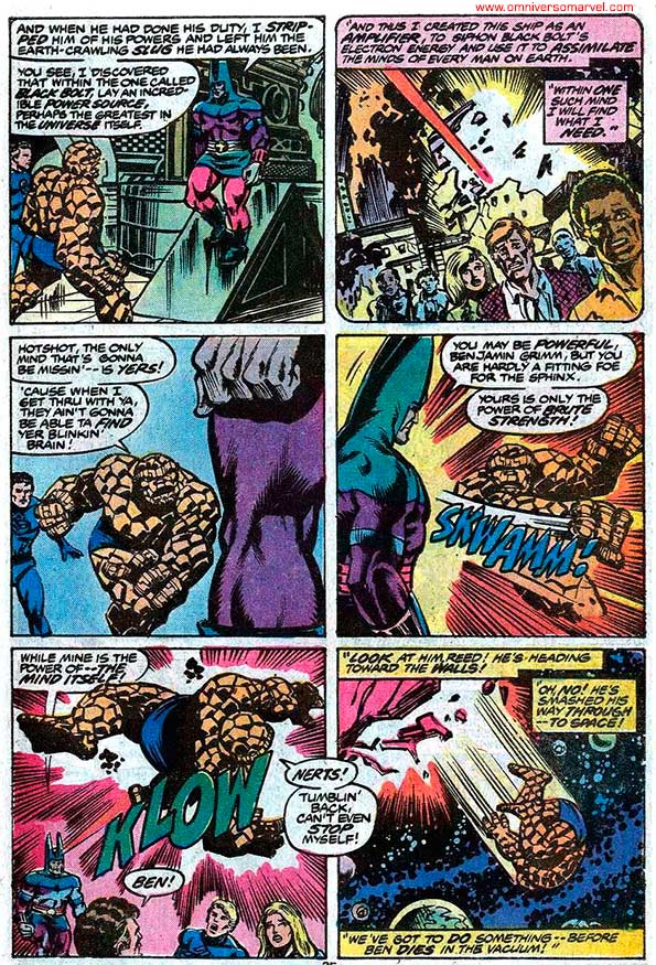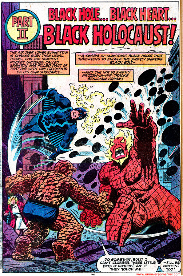 Graviton convertido ahora en un agujero negro viviente, creó mini-agujeros negros. Aunque Rayo logró esquivarlos, Ben Grimm no podría hacer lo mismo y se veía imposibilitado de atacar físicamente tal amenaza que hubiera provocado su muerte. Pero Black Bolt no dejaría a un amigo y aliado sucumbir y usando su habilidad única para manipular electrones creó una inmaterial fuerza resplandeciente, un cuello de botella magnético que fue capaz de drenar y encapsular los mortales mini agujeros negros. MTIOann:v1:4. [Imagen1][Imagen2][Imagen3].