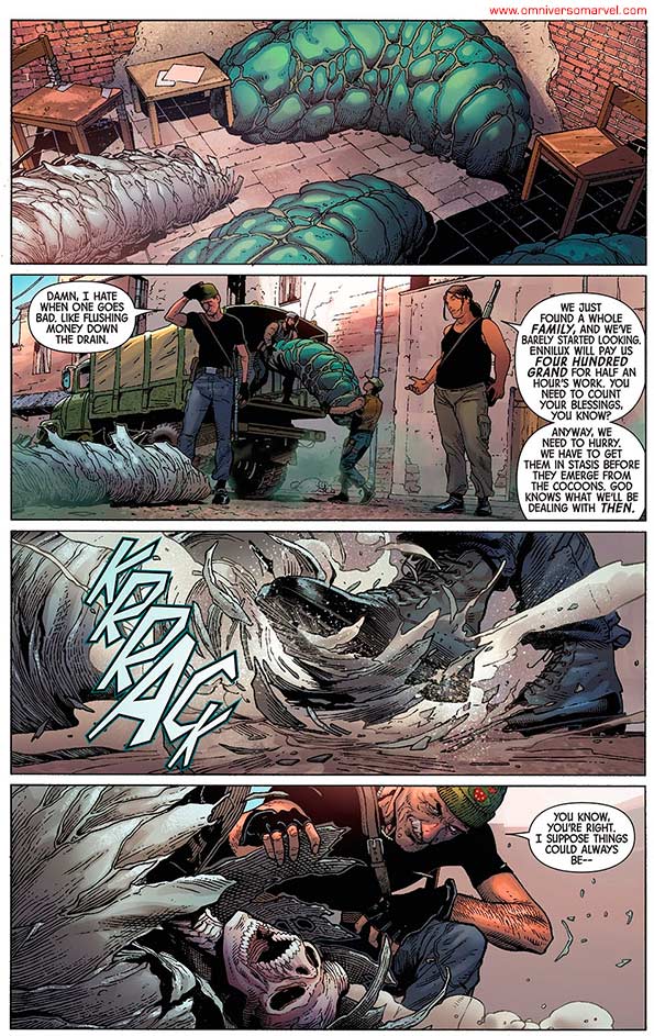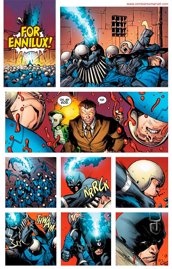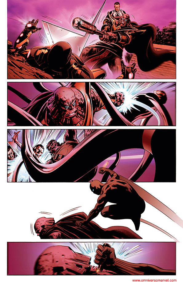 Black Bolt esquivaría una ráfaga de metralla y eliminaría fácilmente a unos mercenarios. UInH:v1:0. [Imagen1][Imagen2][Imagen3][Imagen4].