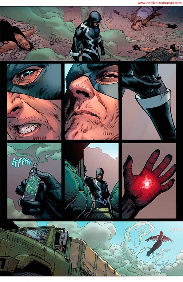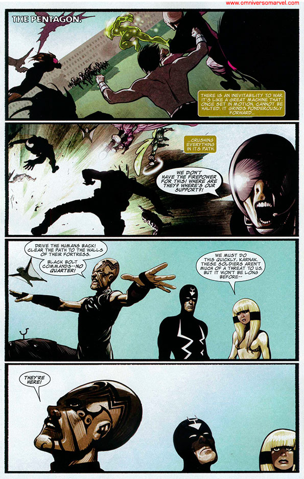 De hecho, cuando Black Bolt volvería a asaltar el Pentágono, los Mighty Avengers acudirían en su defensa. Sentry se mantendría a raya del conflicto y Black Bolt en guardia. Al final Black Bolt obtendría lo que quería no sin antes darles una pequeña muestra de su poder, sólo un susurro, un susurro lo bastante poderoso como para barrer a los Mighty Avengers de Tony Star. SW:v1:5. [Imagen1][Imagen2][Imagen3][Imagen4][Imagen5][Imagen6][Imagen7][Imagen8][Imagen9][Imagen10][Imagen11].