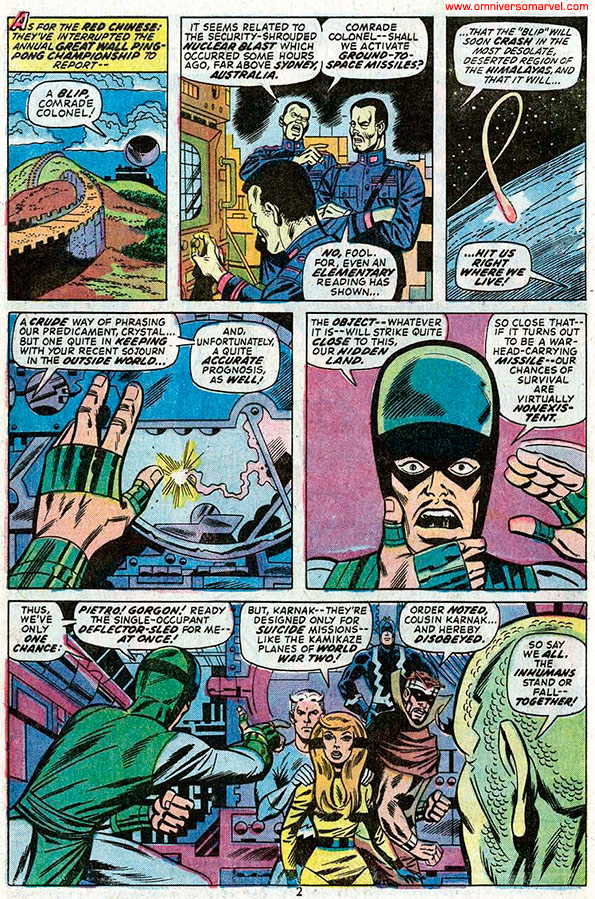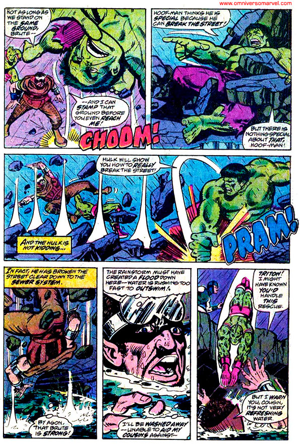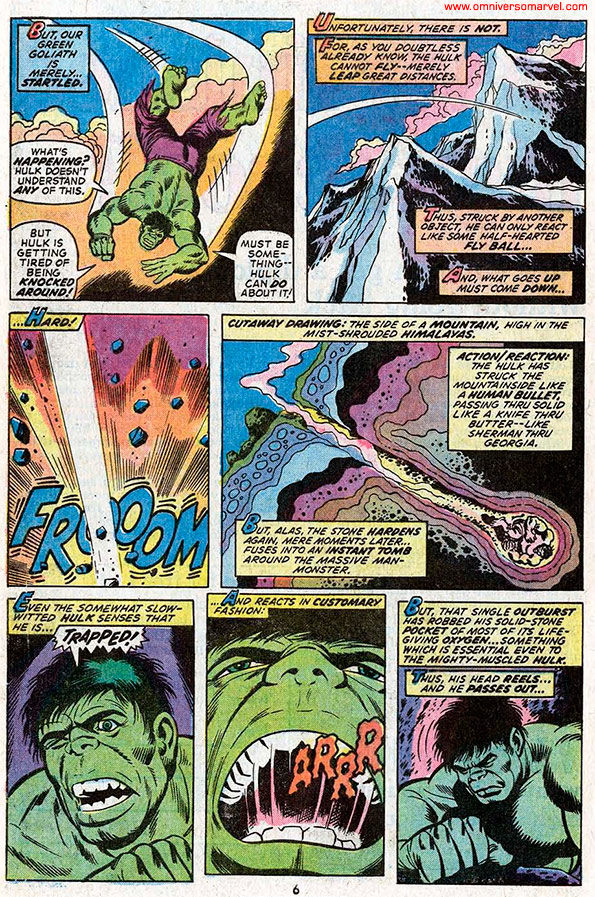 Cuando Hulk se precipitaría desde el espacio hacia el Gran Refugio de los inhumanos, confundido con un misil y ante una posible destrucción inminente, el más poderoso inhumano saldría a detener el objeto. Como un cohete viviente del rey vería que el “misil” no era otro que Hulk, pero no tendría más remedio que detenerlo violentamente. Con un impacto salvaje -que hubiera destrozado a cualquier otro inhumano y atomizado a cualquier otra criatura en instantes- ambos titanes chocarían. Hulk incluso se incrustaría en el himalaya como un cuchillo a la mantequilla derritiendo la sólida roca. IH:v1:175. [Imagen1][Imagen2][Imagen3][Imagen4].