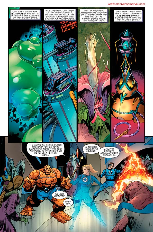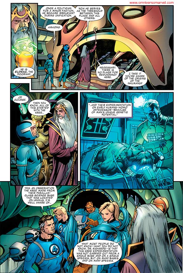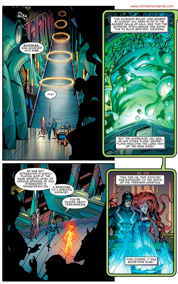 Hace 25,000 años la raza extraterrestre guerrera Kree, manipuló genéticamente a un grupo de humanos (para usarlos como aliados en sus guerras), aprovechando el potencial latente para desarrollar poderes que les dio la raza de seres cósmicos conocida como los Celestiales. Los Kree experimentaron con otras razas por todo el universo. Los inhumanos son una de las 5 razas con las que los Kree tuvieron éxito. Además, dejaron un catalizador especial para la transformación genética de esas razas; en la Tierra ese catalizador fueron los Cristales Terrígenos. 4F:v1:577. [Imagen1][Imagen2][Imagen3].