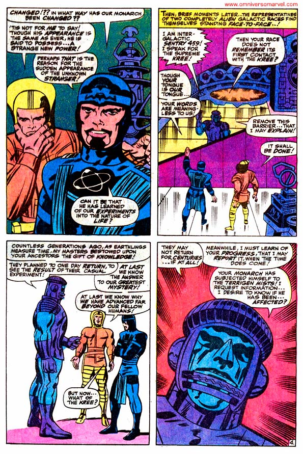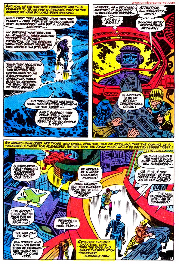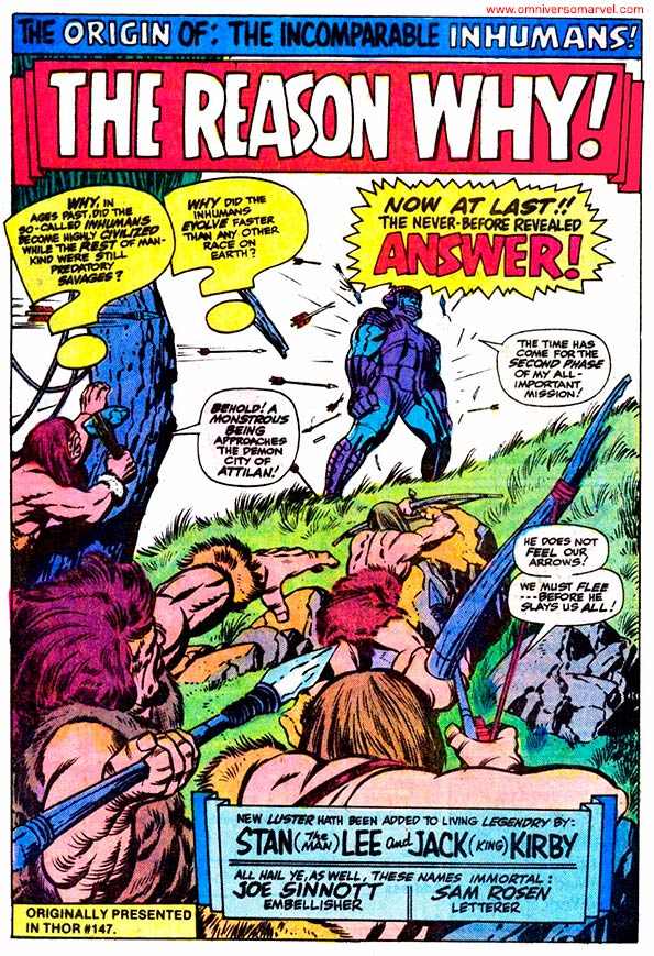 Los Kree también les dieron tecnología y luego los dejaron a su suerte. Ellos evolucionaron más rápido que los demás humanos, tanto así que su ciudad llamada Attilan era ya una urbe super moderna en tiempos que el resto de la humanidad aún era salvaje. Llamados Inhumanos (Inhomo supremis o Homo sapiens inhumanus) por los Kree, su civilización permaneció oculta durante milenios, gobernados por la Familia Real y el Consejo Genético. T:v1:147. [Imagen1][Imagen2][Imagen3] [Imagen4][Imagen5].