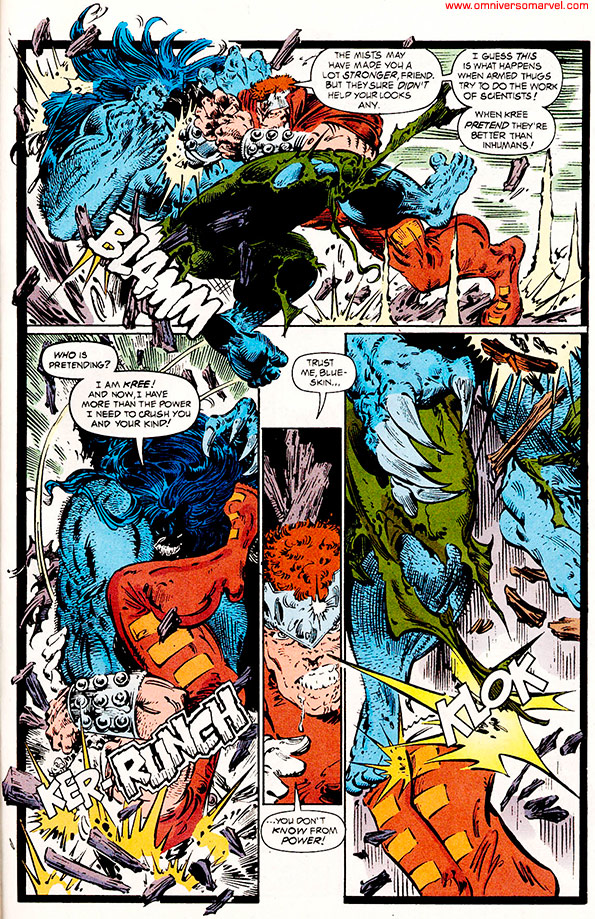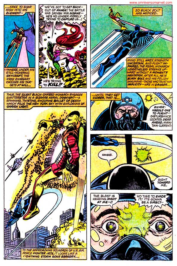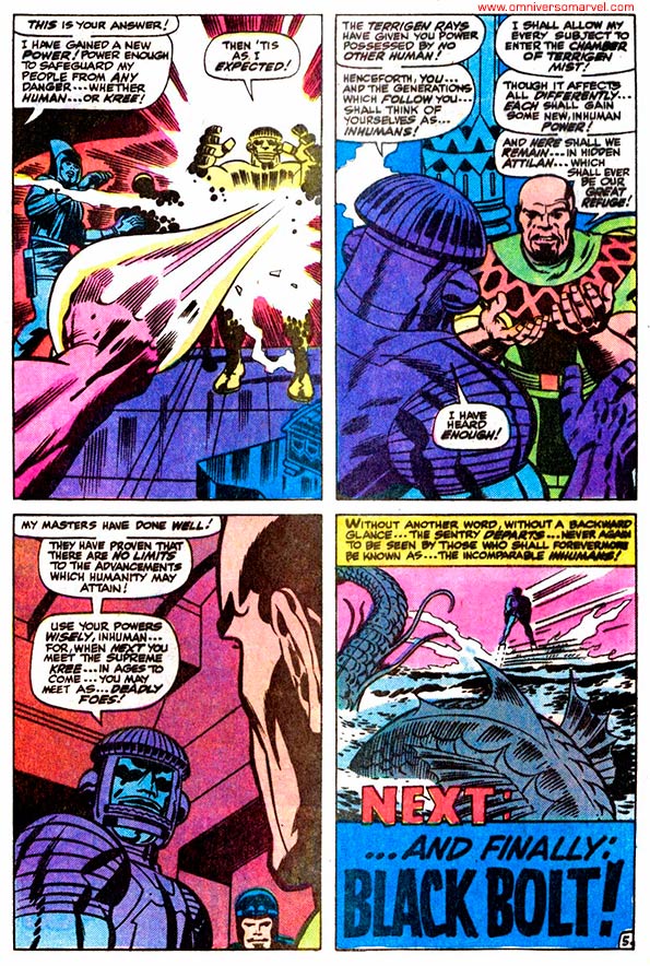 El Mayor Fahr, un soldado Kree que se expuso junto a sus camaradas a las nieblas terrígenas, se convirtió en un ser de energía pura. Los ahora super krees combatieron con los inhumanos, y aunque fueron vencidos, el Mayor Fahr sólo pudo ser desafiado por Black Bolt. Ambos titanes lucharían sobre el área azul de la luna, su despliegue de energía hubiera sido suficiente para alimentar Attilan por más un mes. Rayo haría muestra de su velocidad para combatir, derrotando al super kree con su golpe maestro en una explosión tan fuerte que se vio en la Tierra desde Nairobi (África) hasta Sydney (Australia) y las ondas de choque estremecieron Attilan hasta sus cimientos. InH-TGR:v1:1. [Imagen1][Imagen2][Imagen3][Imagen4][Imagen5][Imagen6][Imagen7][Imagen8][Imagen9][Imagen10][Imagen11][Imagen12][Imagen13][Imagen14][Imagen15][Imagen16][Imagen17][Imagen18][Imagen19][Imagen20].
