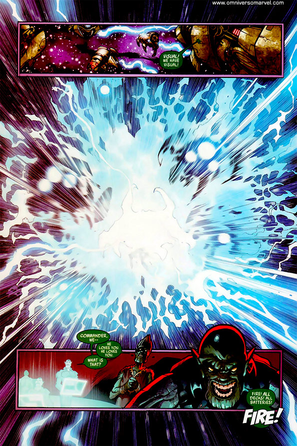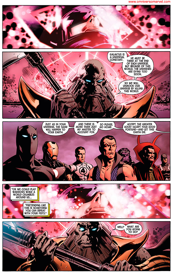 * De esta historia, quiero resaltar que el primer ataque de BB no fue aumentado por magia ya que Extraño sólo menciona su hechizo de protección. Recién sobre el segundo asalto de Rayo menciona que su poder está siendo duplicado y doblado nuevamente una y otra vez por él y los otros hechiceros presentes en el combate. Interpreto que el primer ataque de BB fue limpio y usando únicamente su poder, de hecho, como confirma el Dr. Vudú, él y los demás estaban esperando ver una debilidad en Galactus para atacarlo con todo lo que tuvieran, pero al ver que no era suficiente hicieron esfuerzos desesperados para aumentar el poder de los ataques de BB. Extraño era el único que de hecho esperaba que tanta descarga de energía y sacrificio de todos, resultara en una sobre carga de Galactus.