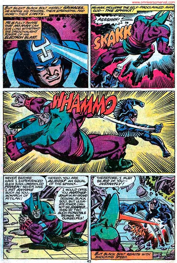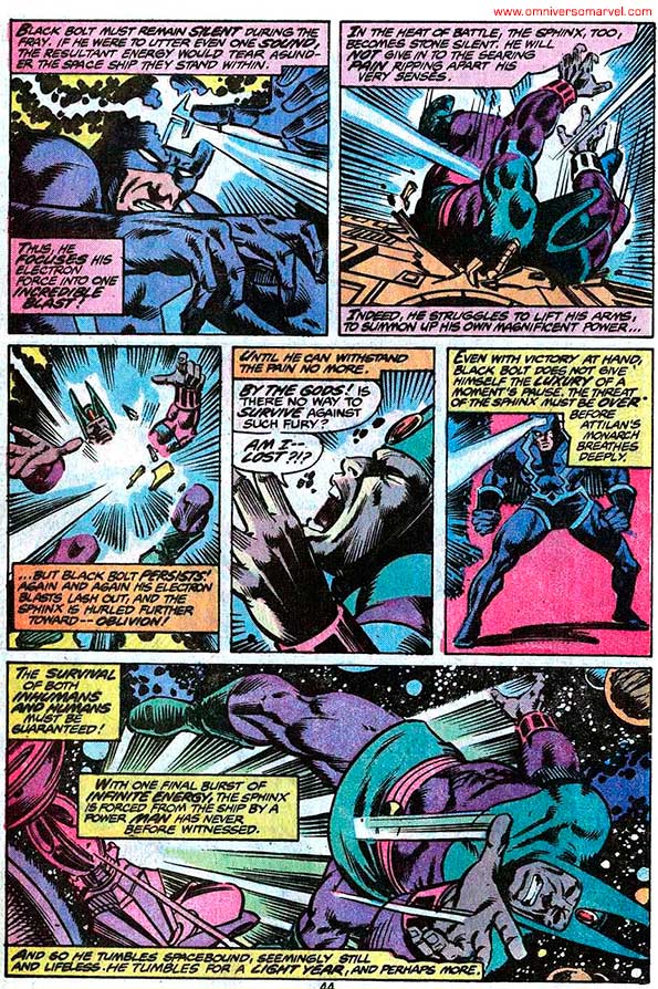 Si bien su voz es su más poderosa arma, en realidad Black Bolt no la necesita para vencer a los más poderosos enemigos. Black Bolt usando sus habilidades ha derrotado a la poderosa Sphinx sin ayuda de nadie. La Sphinx que posee la Piedra Ka que le da poderes en niveles cósmicos, había derrotado fácilmente a los 4 Fantásticos y lo mismo había hecho con los Inhumanos y Quicksilver. Sólo la fuerza, habilidad y poder de Black Bolt demostrarían ser un desafío para él. Rayo dispararía una y otra vez su Electron Blast contra Sphinx, castigándolo y atacándolo sin pausa y piedad, hasta que con un disparo final de energía infinita este titán de nivel cósmico sería arrojado de la nave al espacio. FFann:v1:12. [Imagen1][Imagen2][Imagen3][Imagen4][Imagen5][Imagen6][Imagen7][Imagen8][Imagen9][Imagen10][Imagen11][Imagen12].