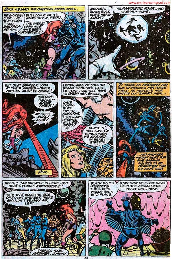 Black Bolt se las arreglaría para mantener la atmosfera dentro de una nave espacial cuando esta fue abierta durante su combate con Sphinx, para luego sellarla nuevamente derritiendo y reacomodando los restos del metal de la nave. 4Fann:v1:12. [Imagen].