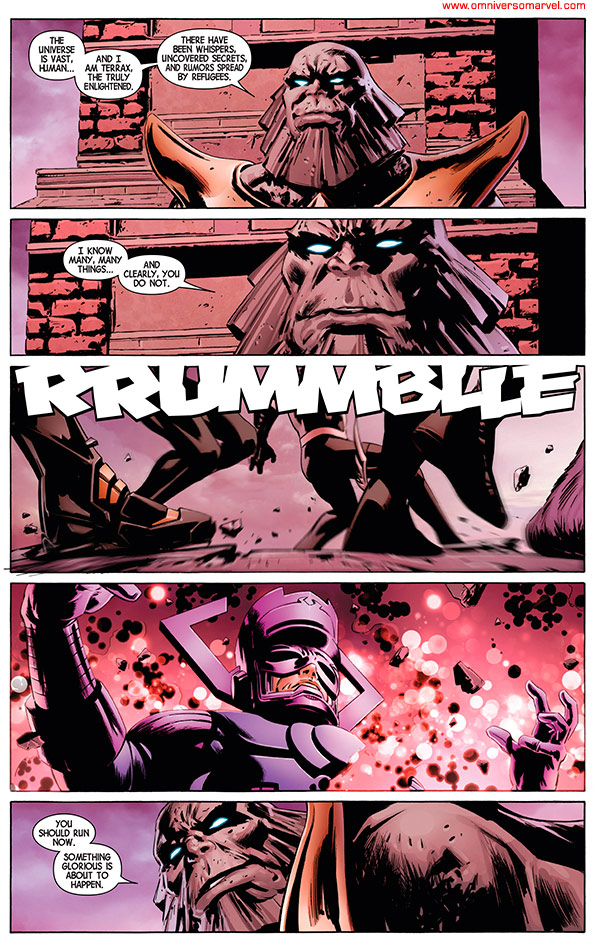 Black Bolt se enfrentaría a un Galactus repotenciado con magia, el devorador de mundos nunca había sido tan poderoso como ahora (hasta ese momento al menos), había vencido a entidades que son consideradas omnipotentes en sus propios reinos como Dormammu, Nightmare y Satannish, y su nuevo nivel fusionaba la ciencia con la magia causando un caos universal que amenazaba con reformar todo la realidad o destruirla, incluso entidades como Eternidad y el Tribunal Viviente habían decidido no interferir. El siguiente desafío verdadero de Galactus no sería un ser cósmico, sino uno que raya muy cerca de ser uno o incluso más, el rey de los inhumanos Black Bolt. El primer ataque del rey sería su más poderosa arma, su voz, que es una explosión de su fuerza física; el Dr. Extraño tuvo que hacer nueve hechizos antes de encontrar uno que lo protegiera a él y sus aliados del daño colateral producido por la potencia de la voz de Rayo Negro. Galactus se tambalea ante el poderoso asalto, sin embargo, este es un nuevo y repotenciado devorador de mundos y no caerá. A pesar de ser reforzado por magia los gritos de Rayo serán inútiles contra Galactus y acabaría siendo absorbido por este, mas no le resultaría fácil a Galactus digerir las energías del rey, y se vería afectado por estas. DS:v5:16. [Imagen1][Imagen2][Imagen3][Imagen4].