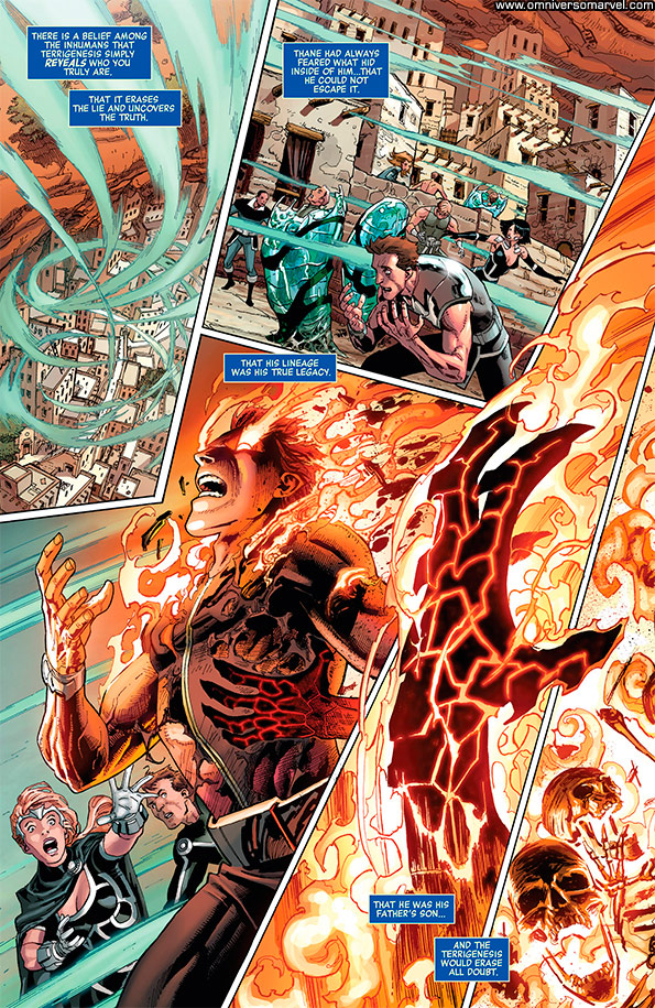 Surgidas como vapores de los Cristales Terrígenos, Las Nieblas Terrígenas son una sustancia mutagénica que causa mutaciones en la raza inhumana a través de un gen particular que posee esta raza, a este proceso lo llaman Terrigénesis y es la causante de la diversidad de poderes y mutaciones que se ven en la raza inhumana. Hay una creencia entre los inhumanos de que la Terrigénesis simplemente revela quien realmente eres, borrando la mentira y descubriendo la verdad. I:v1:4. [Imagen].
