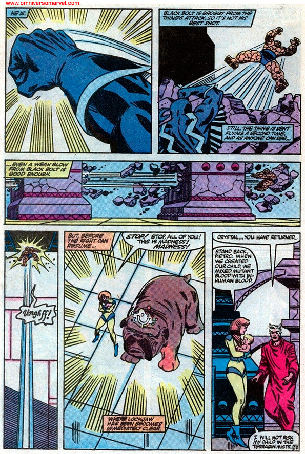 El recién nacido Black Bolt haría su primer berrinche, emitiendo un grito, prácticamente insonoro, en un rango de sonido desconocido por la ciencia inhumana, pero causando unas vibraciones vocales tan intensas que destruirían todo el laboratorio, causando una reacción en cadena que afectaría incluso la propia ciudad. T:v1:148. [Imagen1][Imagen2].