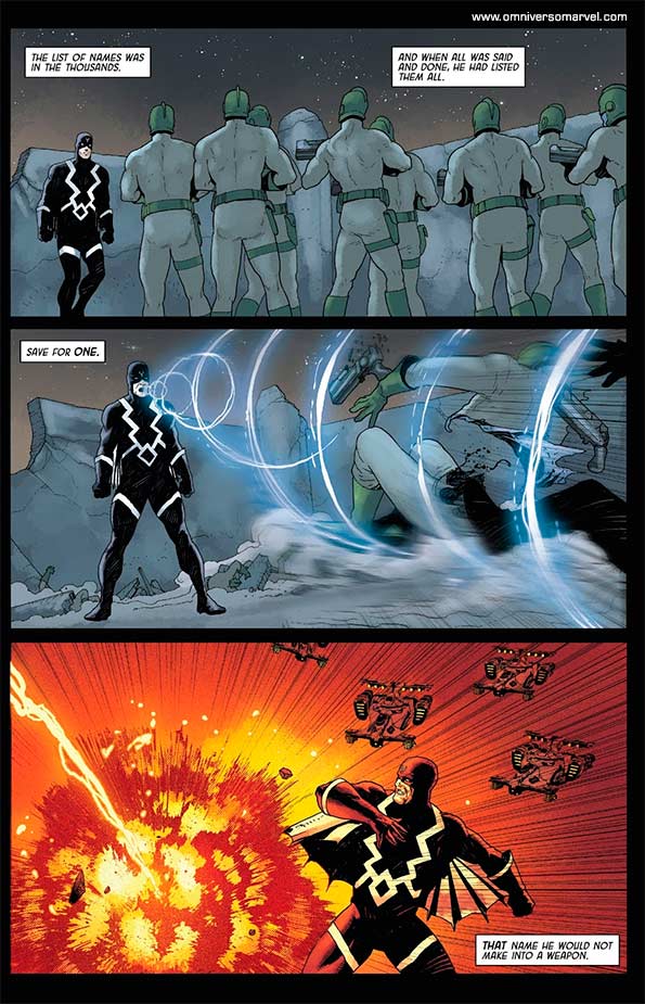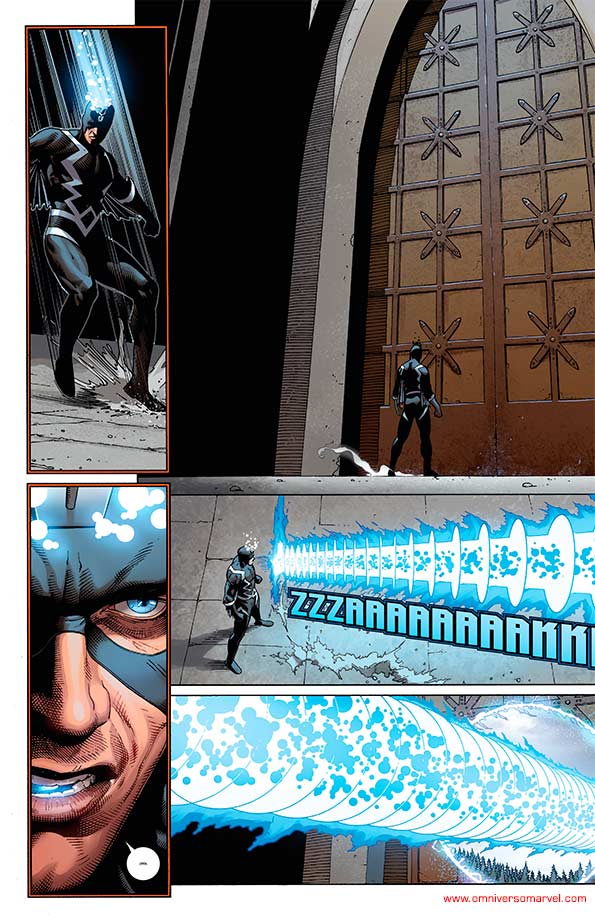 Black Bolt puede generar una explosión de electrones, cuyos efectos son similares a un thunderclap de Hulk. InH:v1:6. [Imagen].