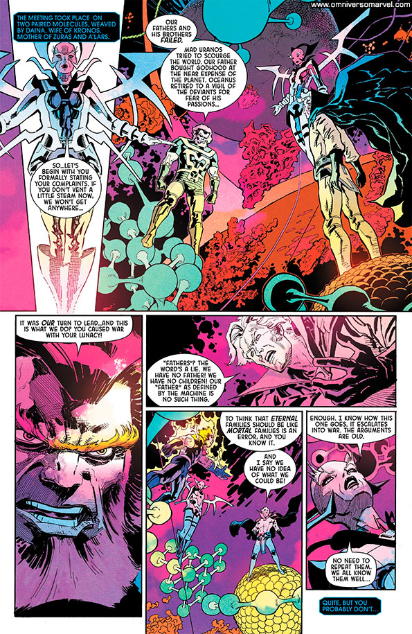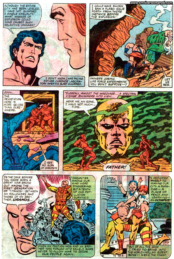 Advertidos los Kree de los desconocidos invasores se organizaron y derrotaron a Uranus y su gente, que acabaron refugiándose en una de las lunas de Saturno. Uranus formaría así una dinastía propia de eternos en un nuevo mundo al que llamarían Titán. Pero su naturaleza belicosa provocó una nueva guerra civil entre ellos y la colonia fue prácticamente destruida. WI...:v1:27-28. [Imagen1][Imagen2][Imagen3][Imagen4][Imagen5][Imagen6][Imagen7].