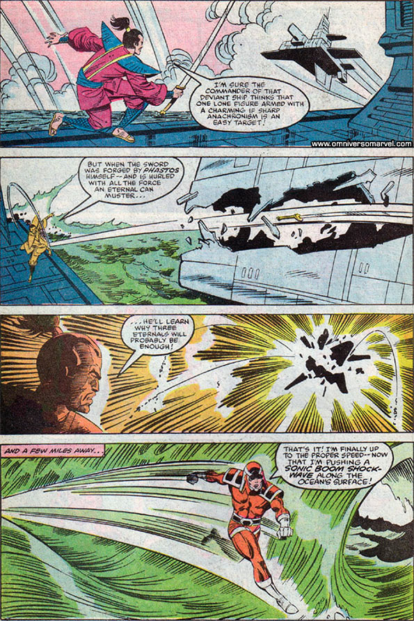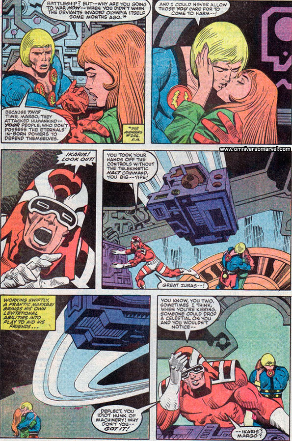 Ikaris y sus amigos se enfrentaría contra una gran flota desviante formada de naves y acorazados de guerra. Ikaris abriría un forado en una de las naves con sus rayos ópticos y luego haría añicos el navío con sus propias manos. E:v2:4. [Imagen1][Imagen2][Imagen3][Imagen4][Imagen5][Imagen6].