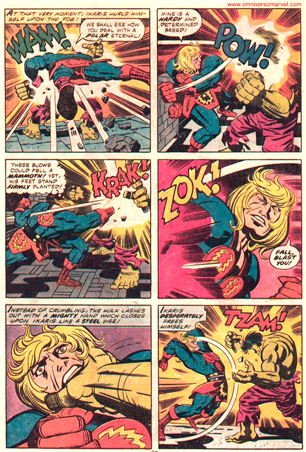 Ikaris, Makkari y Sersi acudieron a investigar un extraño brote de energía cósmica, sin saber que esa fuente era Hulk (o una imitación conocida como el Cosmic-Hulk). Sorprendido por la velocidad del Hulk-Cósmico Makkari sería lanzado como un misil. Ikaris notaria que su fuerza no sería suficiente para derribar tan poderoso enemigo así que recurriría a sus rayos desintegradores. “Hulk” esquivaría el rayo de Ikaris y se alejaría con velocidad prodigiosa. Sersi convertiría a Hulk en una masa de roca, pero su energía cósmica revertiría el proceso. Ikaris se lanzaría al ataque, pero sería detenido con un contundente golpe de Hulk. E:v1:14. [Imagen1][Imagen2][Imagen3][Imagen4][Imagen5][Imagen6][Imagen7][Imagen8][Imagen9][Imagen10][Imagen11].